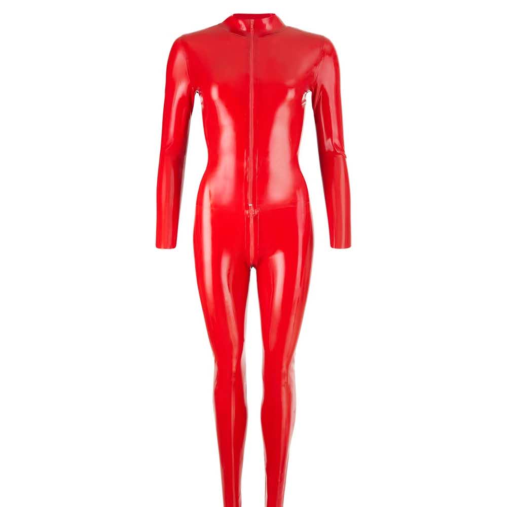 Erotyczny jednoczęściowy! Ten lekko dopasowany kombinezon ze stójką, długimi rękawami i długimi nogawkami otula od stóp do głów czerwonym lateksem i podniecająco podkreśla kobiece kształty, a 50-centymetrowy zamek błyskawiczny z przodu oraz zamek w kroku zachęcają do wyuzdanych wygłupów…. Wiązana w pasie. Lateks, wykonany przy użyciu naturalnego lateksu kauczukowego, który może powodować alergie.