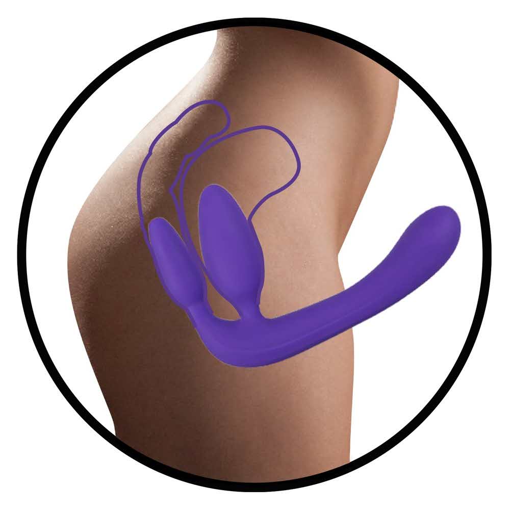 Vaginal plug, anal plug and dildo – all in one. Purple. Total length: approx. 20 cm. Length vaginal plug: approx. 10.5 cm. Length anal plug: approx. 8.5 cm. Diameter plugs and dildo: 1.4-4 cm. Material: silicone.