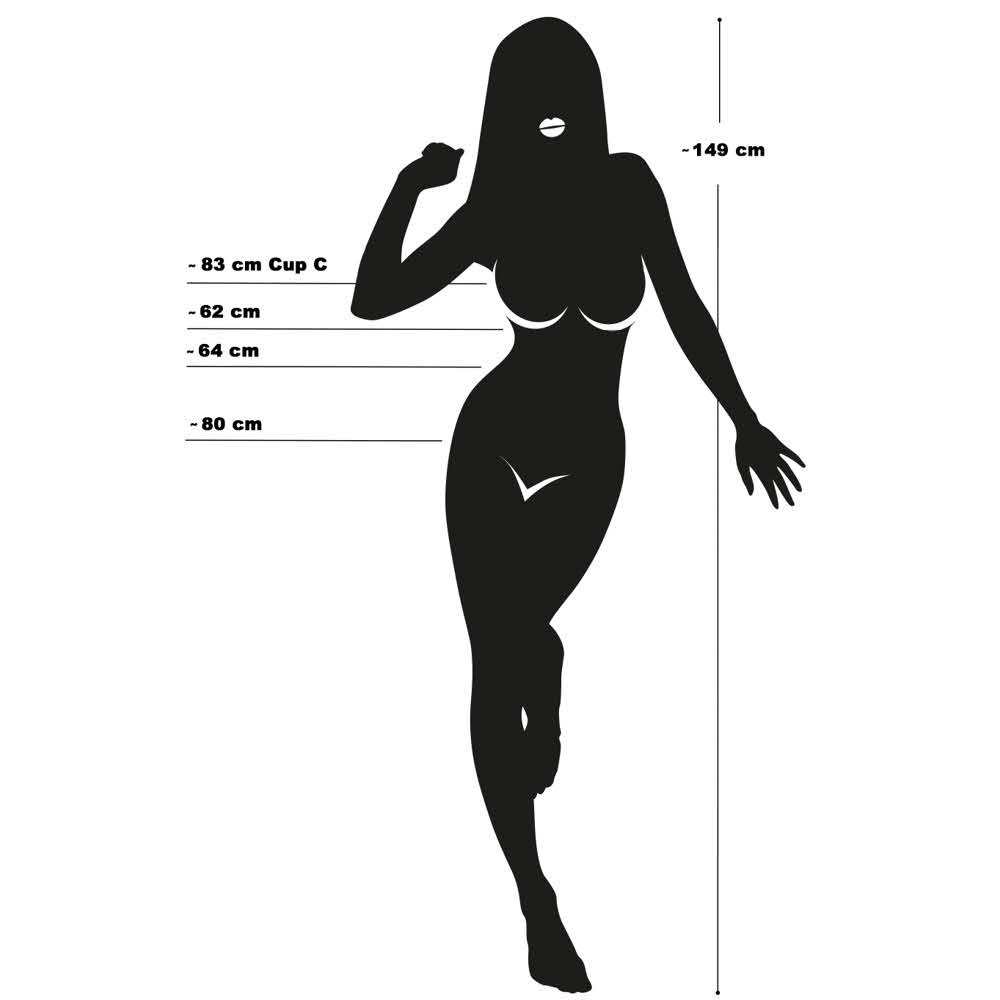 Blondynka z zadziorną grzywką! Ta wymarzona dziewczyna z PCV to prawdziwa petarda namiętności. Piękna twarz z zadziorną grzywką promieniuje sympatią, a 3 otwory miłosne zapraszają do odkrywania intymności. Piersi są ozdobione pięknymi sutkami i szczególnie na wieczorze kawalerskim ta lalka miłości jest gwiazdą. Długość całkowita 149 cm, głębokość wprowadzenia do pochwy 13 cm, głębokość wprowadzenia do jamy ustnej 11,5 cm, głębokość wprowadzenia do odbytu 12,5 cm. PVC.