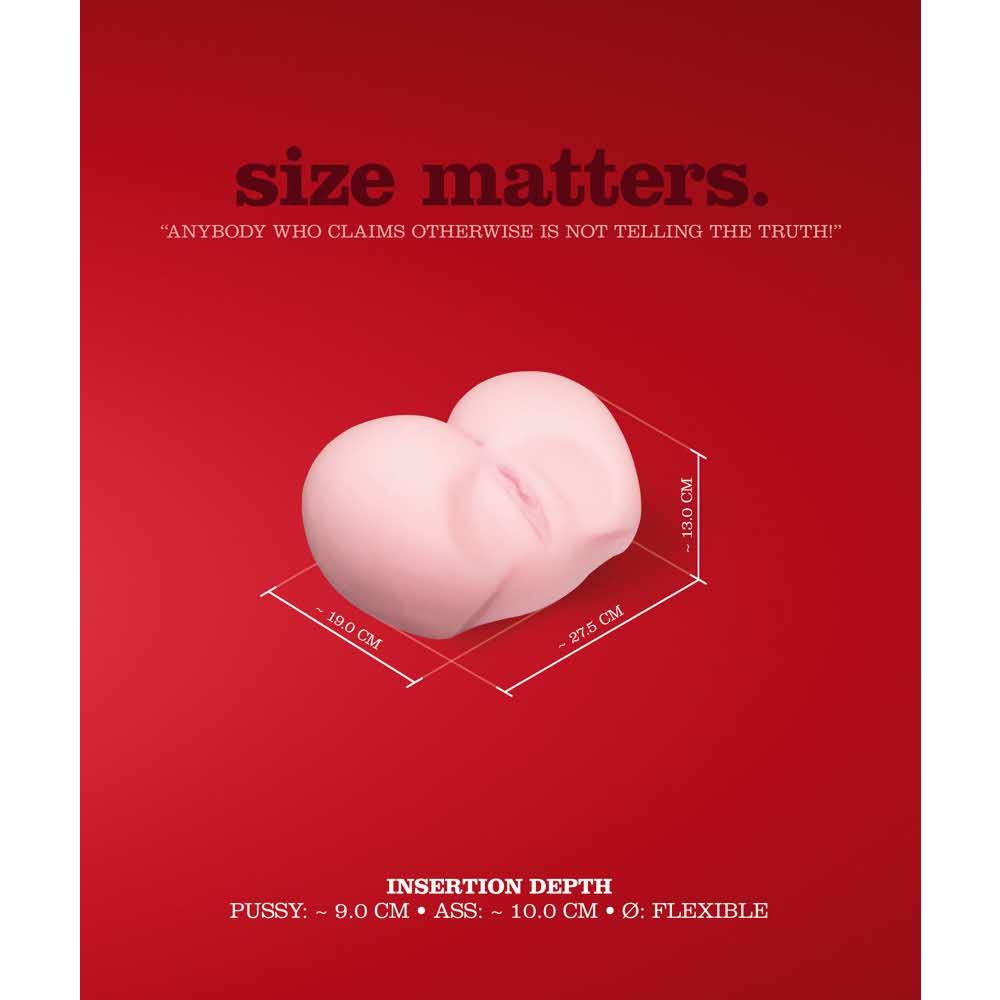 Weź mnie od tyłu! Masturbator Doggy Style marki You2Toys w kształcie tyłka z szczegółowo odwzorowaną pochwą i otworem odbytu z otwartymi kanałami przyjemności po obu stronach: kanał pochwy wypustkami wewnątrz (9 cm głębokości), kanał odbytu rowkami wewnątrz (10 cm głębokości). Długość 19 cm, wysokość 13 cm, szerokość 27,5 cm, średnica bardzo rozciągliwy. Masa 3,7 kg. TPE.