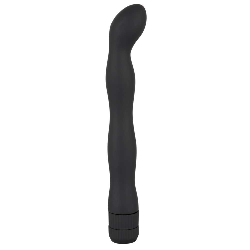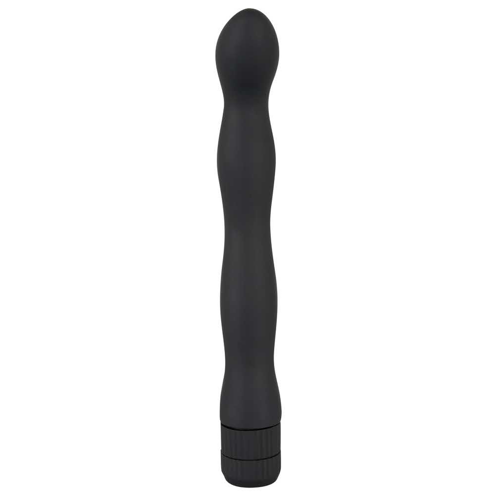 Wavy vibrator with rounded, slightly curved tip. Vibration continuously adjustable. Black. Length approx. 18 cm, Ø 1.7-2.4 cm. Material: ABS. (Please order batteries separately: 2 x AAA (Micro)