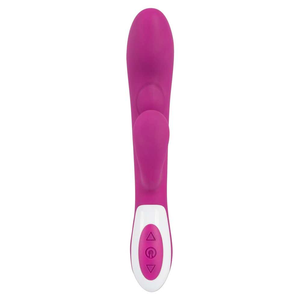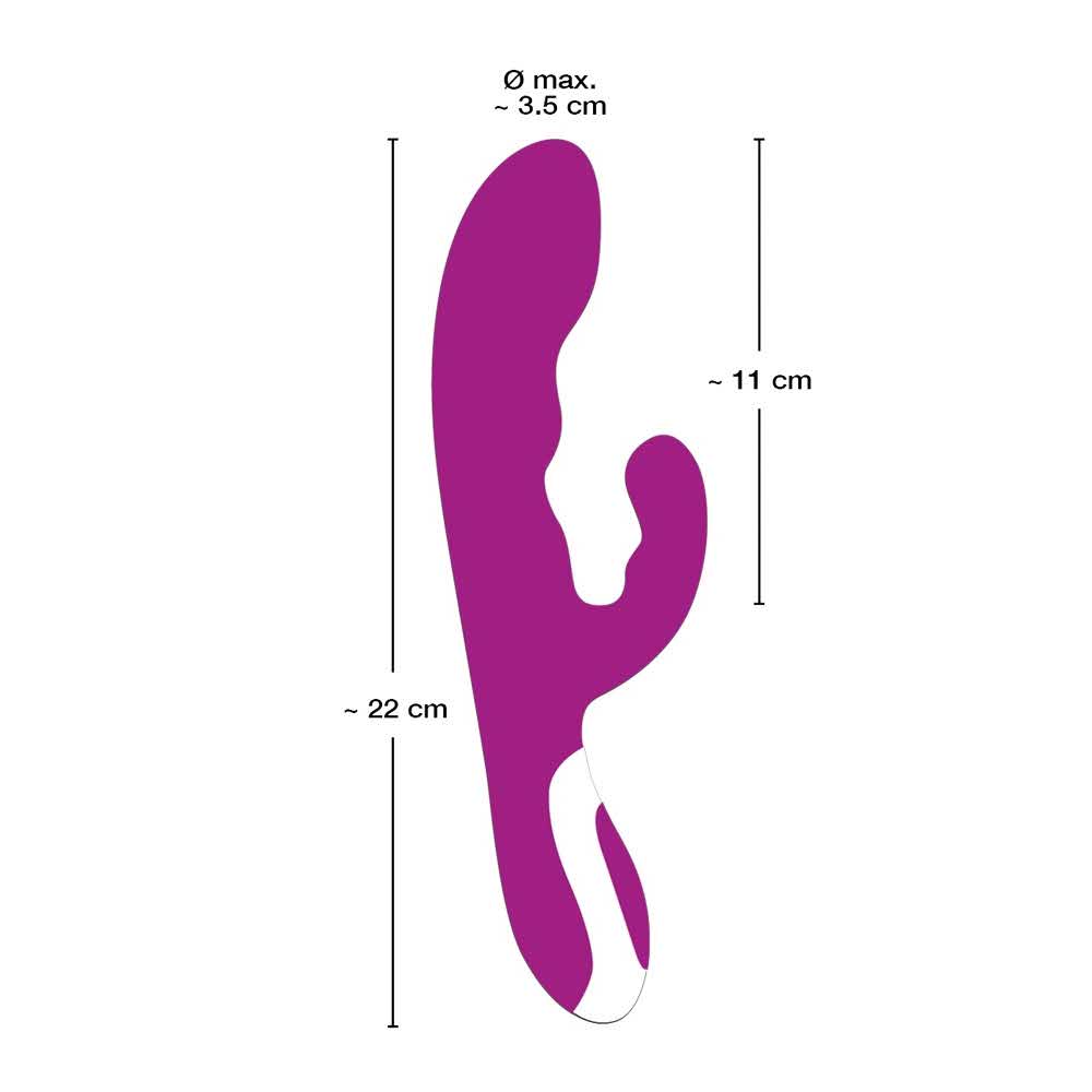 Gorące uroki gwarantowane! Ekstrawagancki kochanek z niezwykłymi funkcjami. Fioletowy wibrator z ramieniem do stymulacji łechtaczki posiada dwa silniki, które umożliwiają nie tylko stymulację pochwy, ale również łechtaczki. Jeden silnik znajduje się w wale, drugi w ramieniu stymulacji łechtaczki, oba mają 5 trybów wibracji, sterowanych oddzielnie za naciśnięciem przycisku. Szczególną atrakcją jest jednak funkcja ogrzewania końcówki wału: po włączeniu wibratora końcówka nagrzewa się do przyjemnej temperatury 42 °C. Możliwość ładowania za pomocą dołączonego kabla ładującego USB. Długość całkowita 22 cm, głębokość wsunięcia 11,5 cm, średnica 2,6-3,5 cm. Materiał: ABS, silikon z powłoką PU.