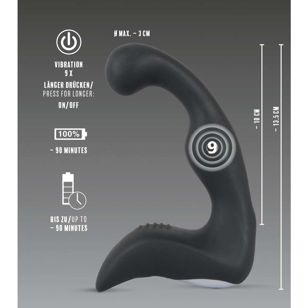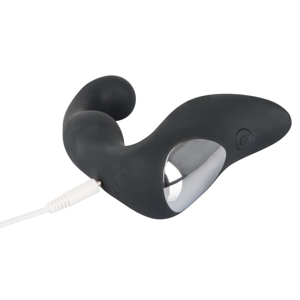 Ĺadowalny! Elastyczny wibrator prostaty z zakrzywioną głowicą, wałem kulistym i stymulatorem krocza z rowkami stymulującymi. 9 trybów wibracji. Możliwość ładowania za pomocą dołączonej wtyczki USB. Czarny. Długość całkowita 14,6 cm, głębokość wprowadzenia 10,5 cm, średnica 2-3 cm stymulator krocza 9 cm długości. Materiał: silikon z powłoką poliuretanową, ABS.