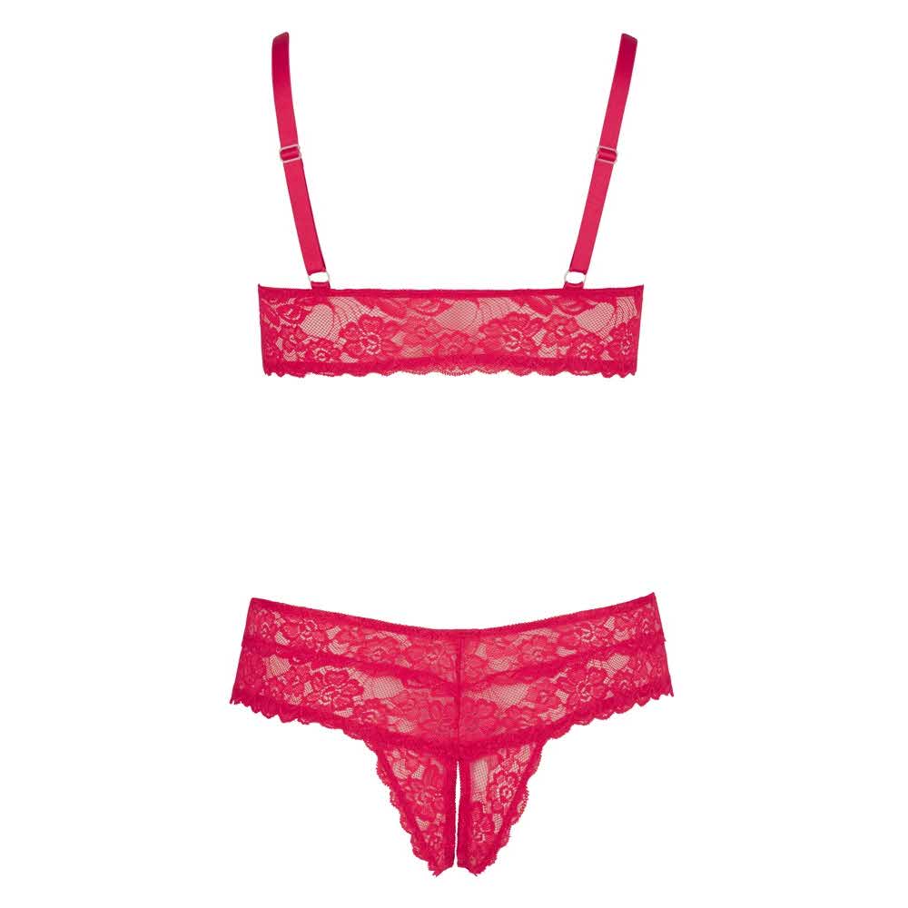 Delicate red lace: wireless bra without fasteners and with adjustable straps. Fancy, crotchless briefs for passionate hours with your partner.