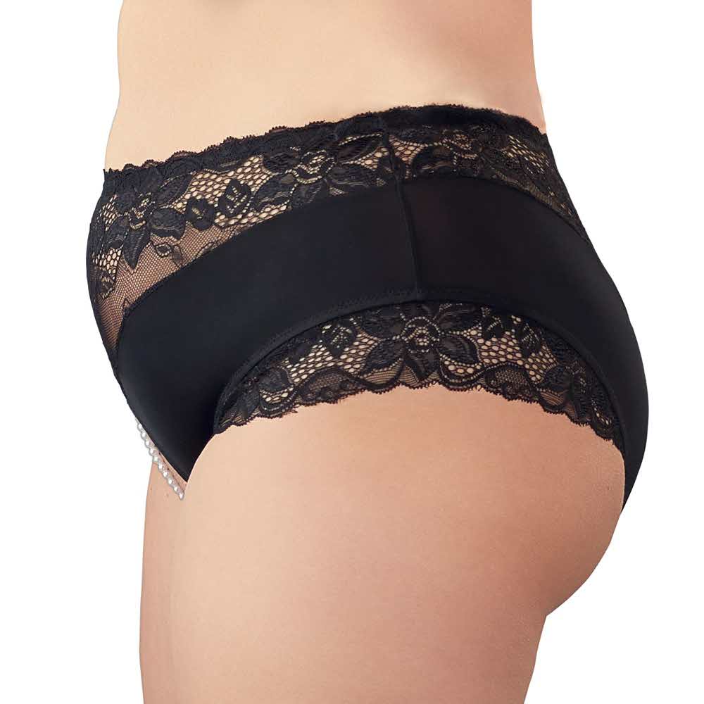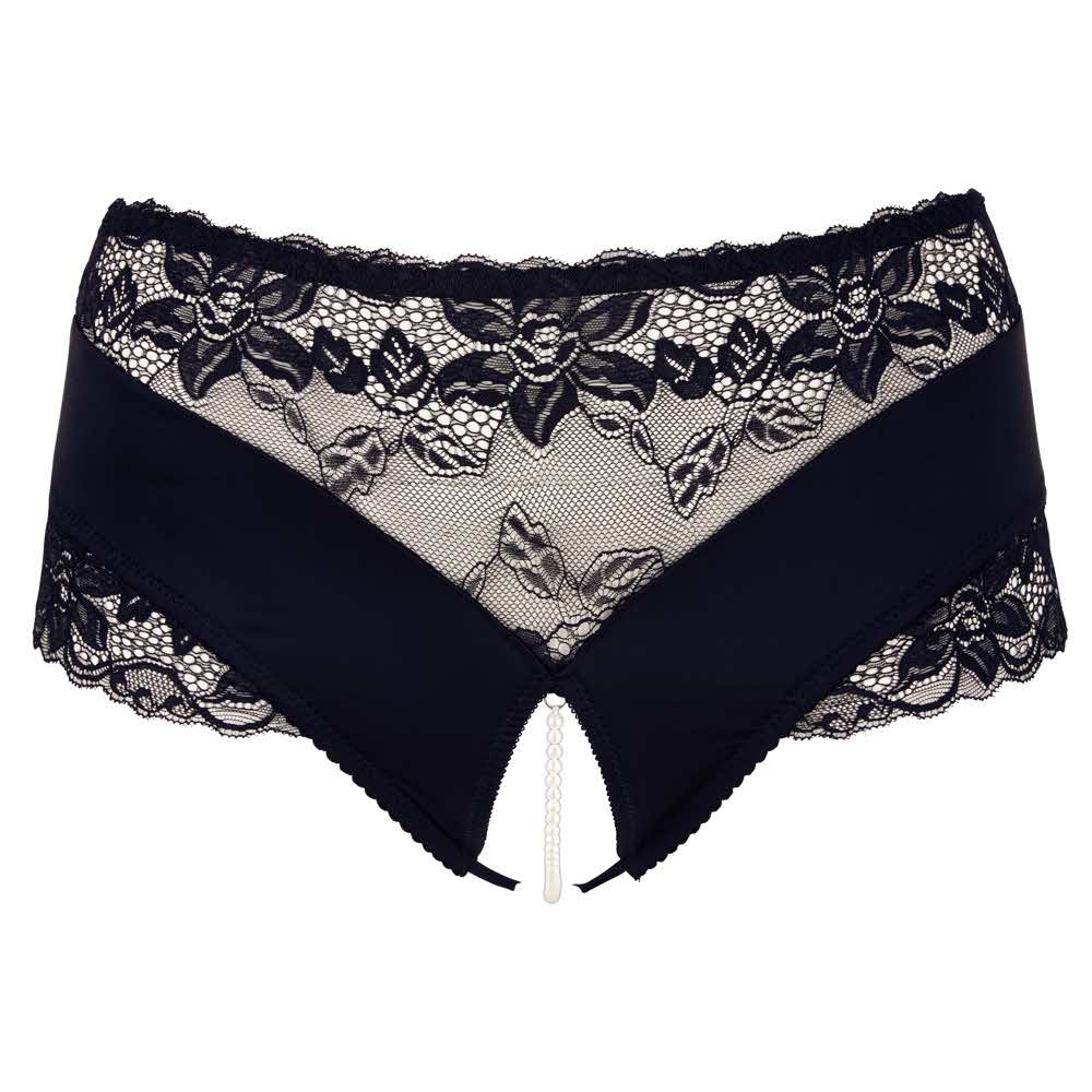 Uwodzi i mrowienie w tym samym czasie! Figi do pasa z delikatną koronkową wstawką i elastycznym naszyjnikiem z pereł w otwartym kroku. Zapierający dech w piersiach seksowny i jednocześnie pobudzający z każdym ruchem. 95% poliester, 5% elastan koronka 90% poliamid, 10% elastan.