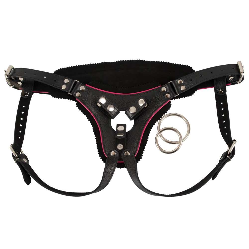 Stabilny i regulowany! Czarna, lekko wyściełana uprząż strap-on dla kobiet. Możliwość regulacji na biodrach i pośladkach. Dzięki dwóm pierścieniom o różnej wielkości można przymocować różne dilda. Wykończone gładką skórą na zewnątrz i zamszem wewnątrz. Z psotnym zygzakowatym brzegiem o tradycyjnym wyglądzie i różową lamówką. Pierścienie średnica˜ 4 cm i średnica˜ 5 cm. Skóra/skóra surowa (skóra naturalna, bydlęca) garbowana bezchromowo, metal. Zawiera nietekstylne części pochodzenia zwierzęcego. Bez dildo.