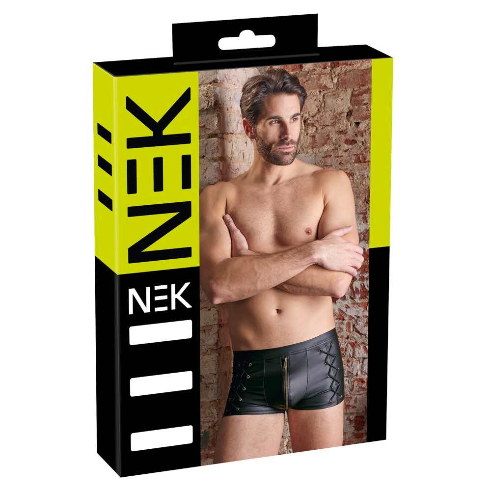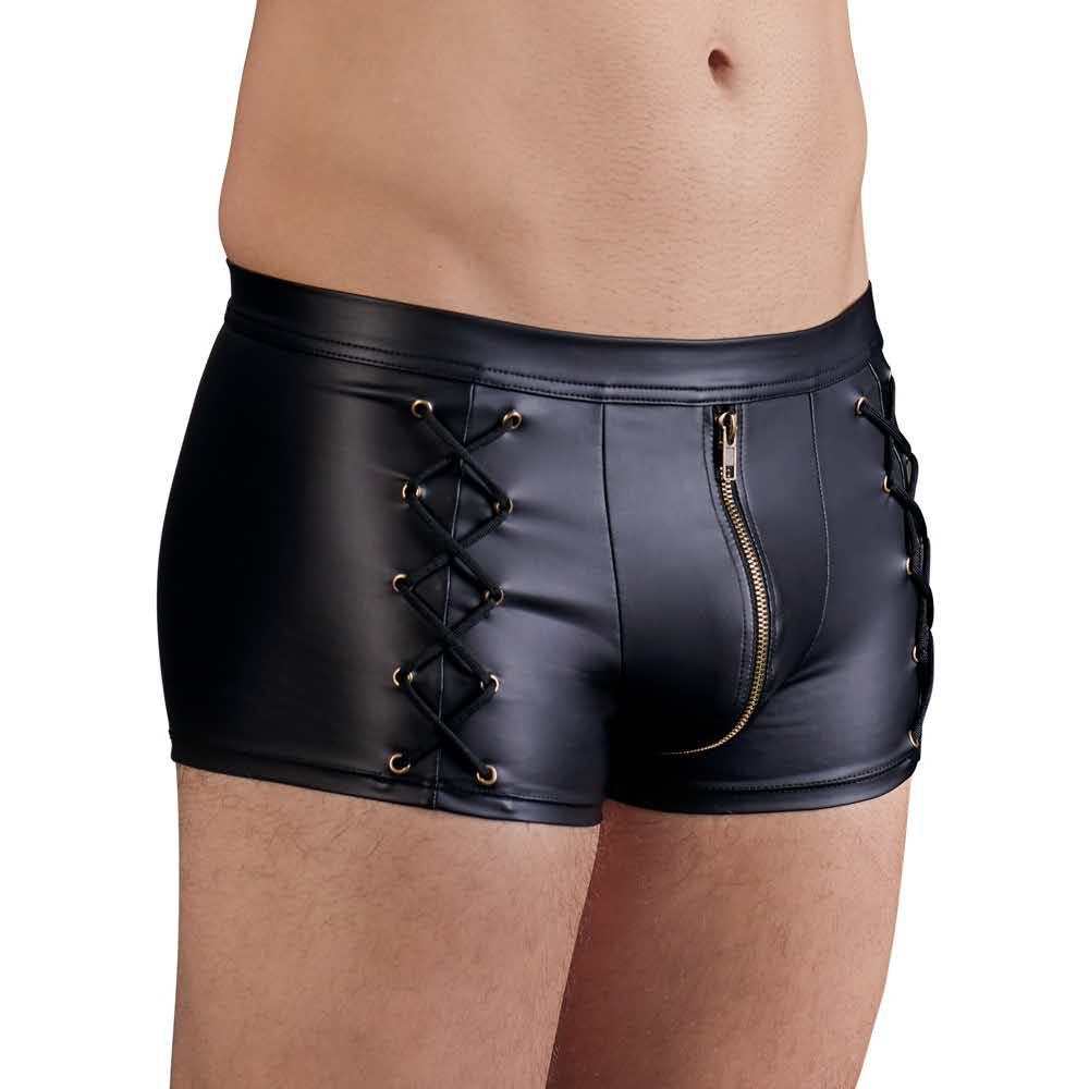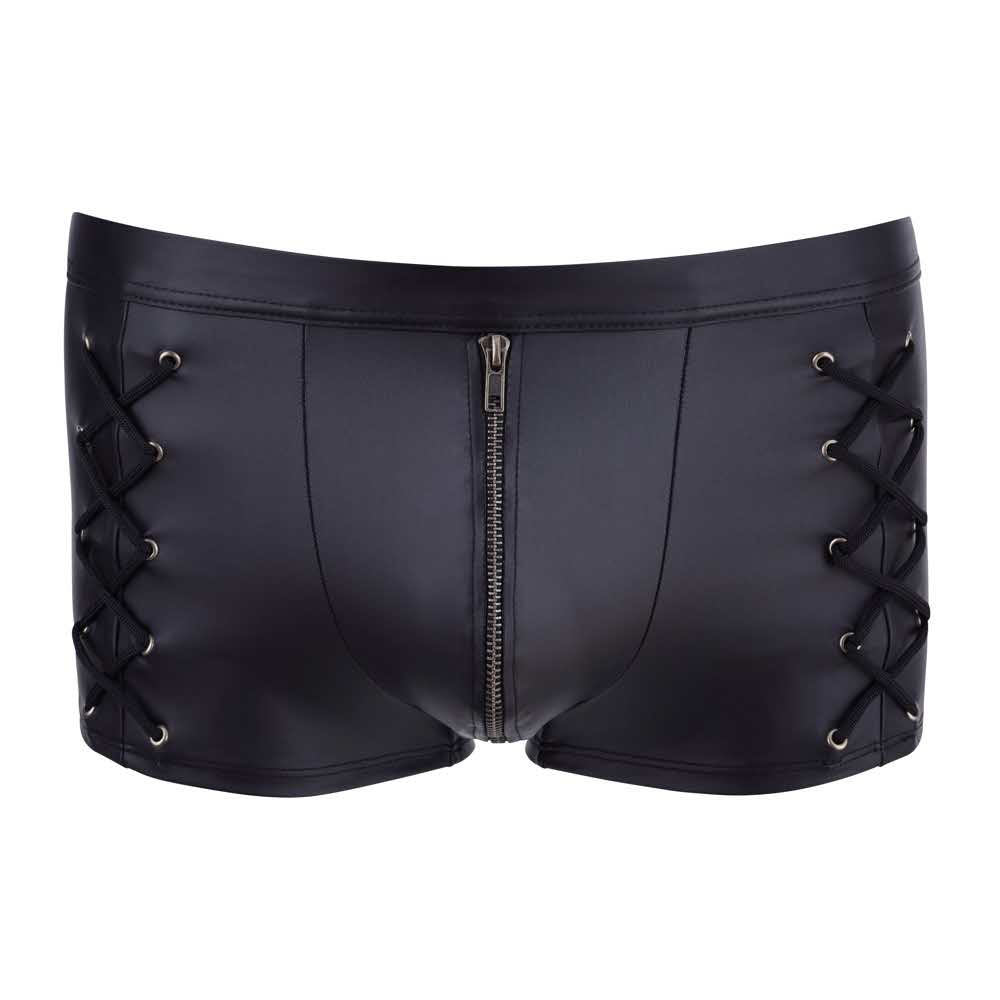 Męski i efektowny wygląd w szlachetnym matowym odcieniu! Czarne spodnie z podklejonym mosiężnym zamkiem z przodu. Po bokach efektowne sznurowanie. W pasie elastyczna guma. Elastyczne, przytulne, najwyższej jakości o wysokim komforcie noszenia. 90% poliester, 10% spandex, powłoka poliuretanowa.
