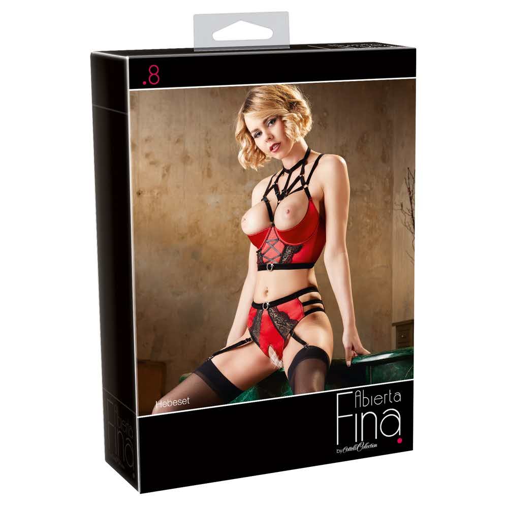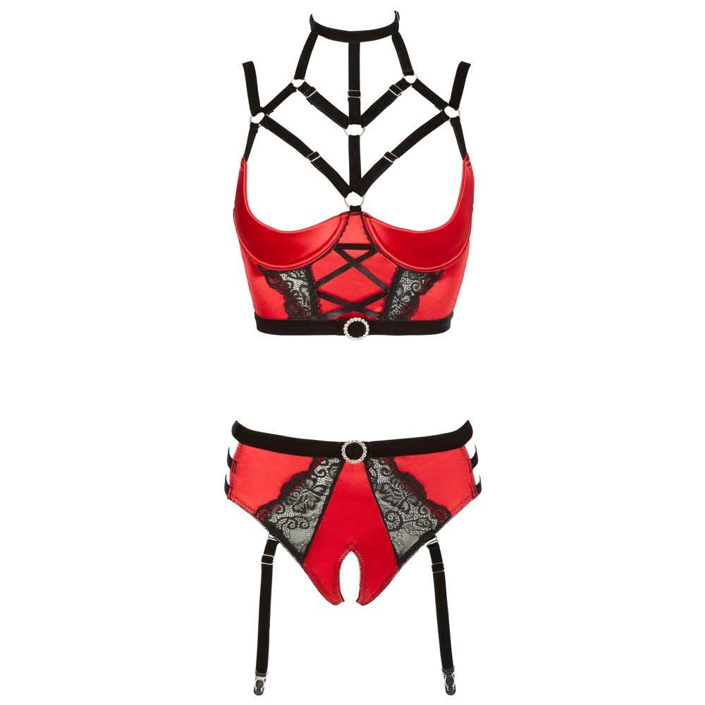Dopracowane do ostatniego szczegółu! Zmysłowy satynowy biustonosz z lekko podszytą taśmą nośną i regulowanymi detalami paska wraz z regulowanym kołnierzem. Z półprzezroczystymi koronkowymi wstawkami i ozdobnym sznurowaniem pod spodem. Pierścień z kryształu z przodu talii uzupełnia wygląd. Pasujące do siebie majtki bez krocza są dopasowane do wysokości talii i mają regulowane, odpinane szelki. Trzyma się go na biodrach za pomocą 3 elastycznych pasków. Z dodatkowym pierścieniem z dżetu w talii i półprzezroczystymi koronkowymi wstawkami z przodu i z tyłu. 90% poliamid, 10% elastan.