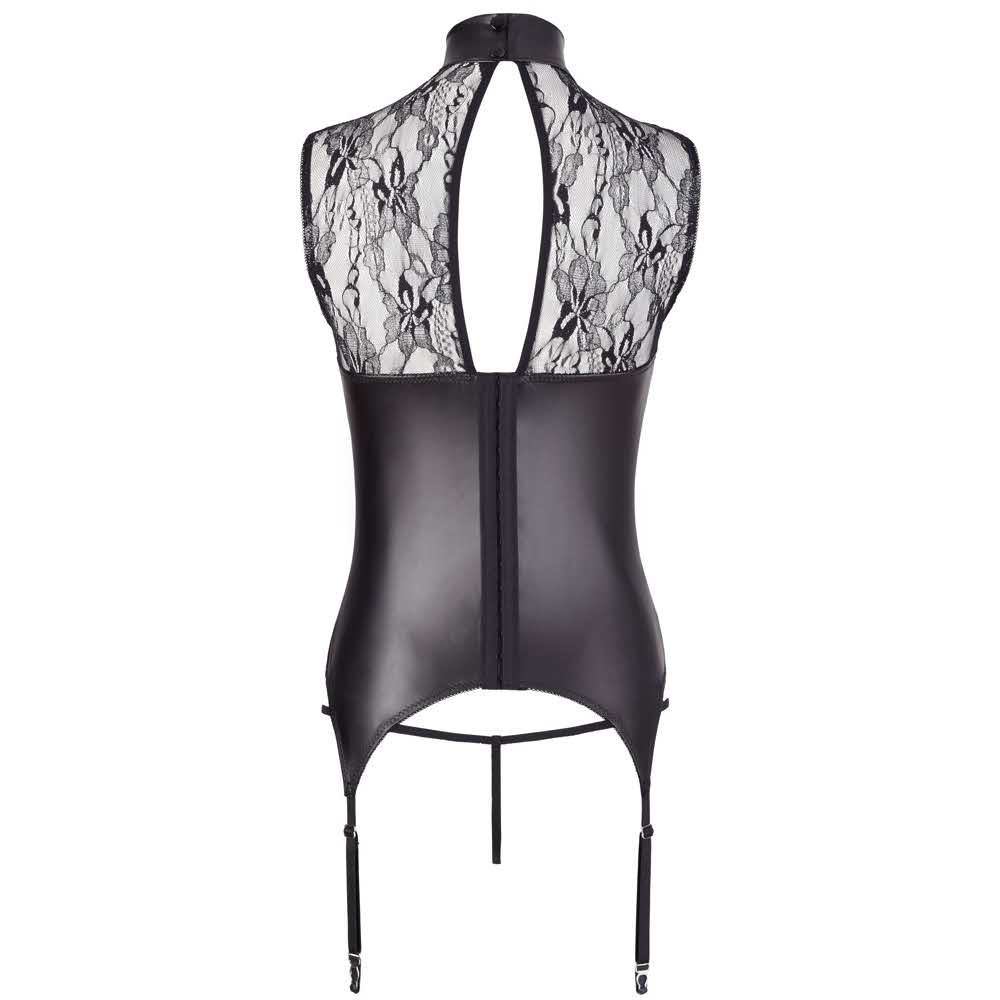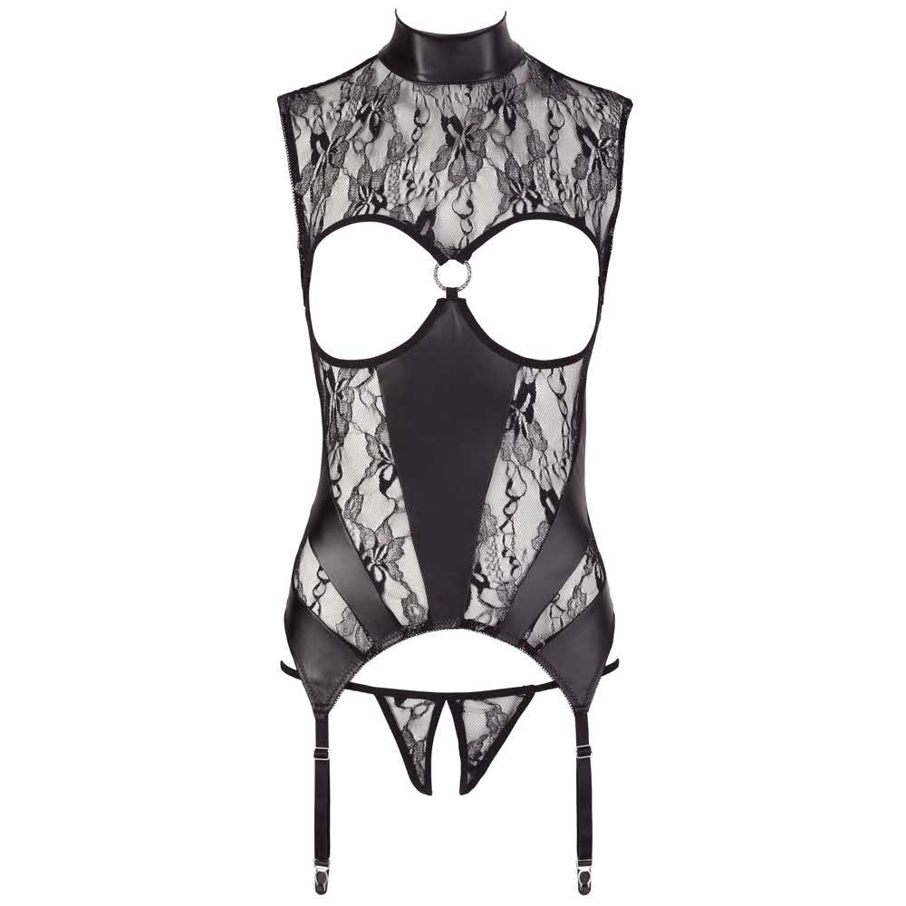 Ekstrawagancki i zapierający dech w piersiach uwodzicielski! Koszula bez biustu z podszewką i dużym pierścieniem z dżetu z przodu. Z tyłu zapięcie na hak i 2 małe guziki do kołnierzyka. Szelki mają regulowaną długość. Wykonane z dwukolorowej koronki kwiatowej, pomysłowo połączonej z matowymi wstawkami z tkaniny. W tym sznurek koronkowy bez krocza. 90% poliester, 10% elastan koronka: 90% poliamid, 10% elastan.