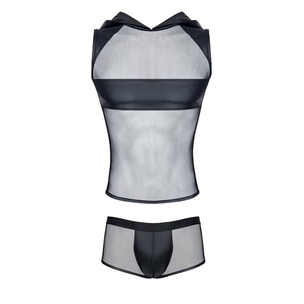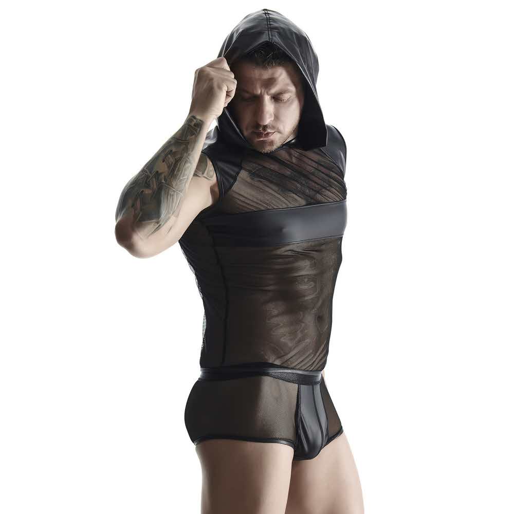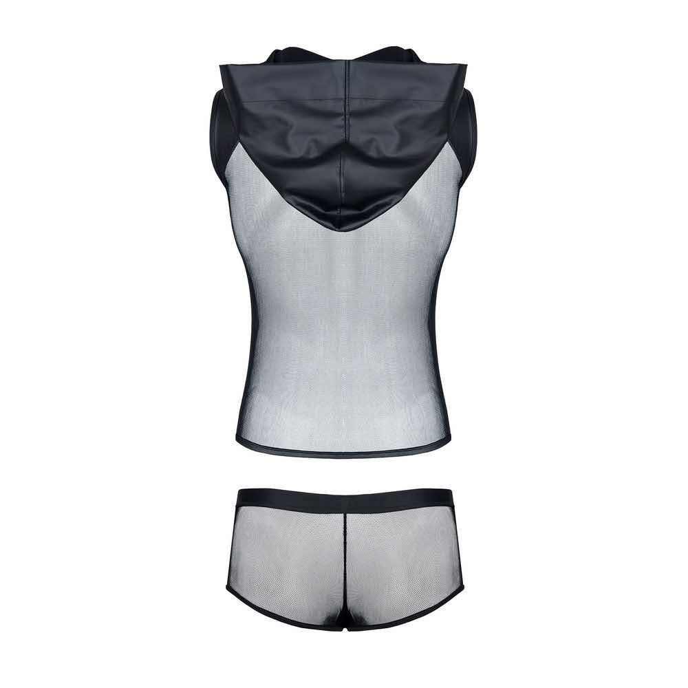RFP regnes fetish planet to pasja, kreatywność, oryginalność… To otwarcie na nowe doznania i bagaż zaskakujących i zapadających w pamięć momentów. Marka kieruje swoje produkty do osób ceniących sobie modę, seksowną bieliznę, odzież clubwear, a także mających jasno określone upodobania fetish. Mężczyzn kreatywnych, ciekawych, lubiących eksperymentować, świadomych swoich potrzeb. Poszukujących nowych doznań, inspiracji. Oczekujących wysokiej jakości produktu. Wygodnego, trwałego i wyróżniającego się niecodziennym wzornictwem. Produkty oznaczone logo RFP regnes fetish planet pięknie wyglądają, są wygodne i trwałe. Podnoszą one temperaturę zabaw, a jednocześnie pozwalają na inspirujące eksperymenty. Majtki z rozwiązaniem BigBossEFFECT, koszulki z dostępem do piersi, zestawy „soft bondage” z gumek, majtki z otwartym tyłem, otwarte kieszonki w szortach… Te i inne rozwiązania zostaną docenione i z pewnością zagwarantują miłe doznania. Opis produktu: koszulka z elastycznej i miłej w dotyku siateczki / szeroki kaptur, ramiona i pas na piersi z elastycznej ekoskóry / wzmacniające przeszycia oraz szorty z elastycznej siateczki i ekoskóry / miła w dotyku szeroka gumka na obwodzie / kieszonka BigBoss / wzmcniające przeszycia; 92% polyamide / 8% elastane