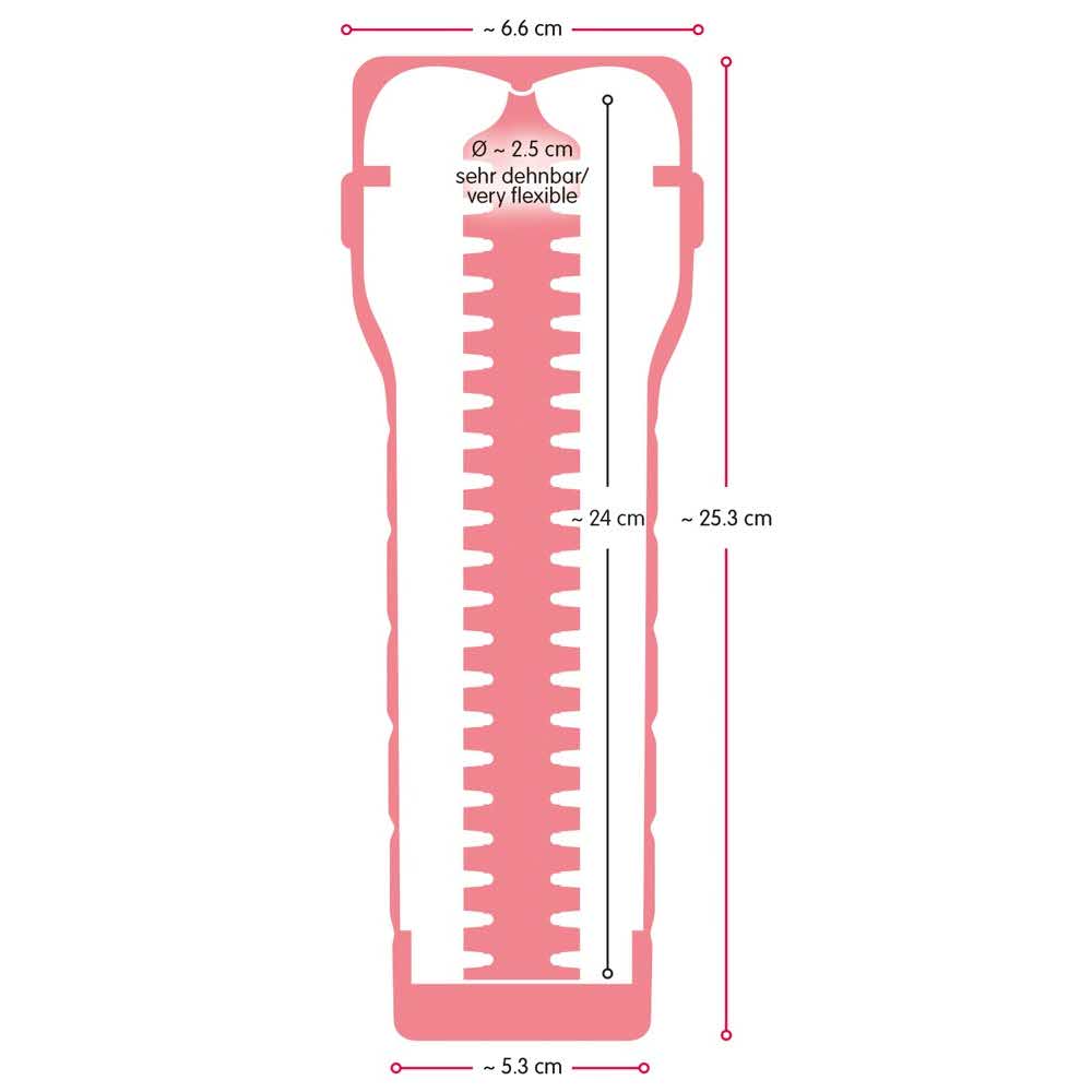 Z ekscytująco nubbingowanym kanałem przyjemności! Masturbator z otwarciem pochwy i czarną pokrywą. Obustronnie otwarty kanał przyjemności jest otwarty, dzięki czemu czyszczenie można wykonać szybko i higienicznie. Rękaw można również zdjąć z pokrywy. Miękki, przypominający skórę materiał daje użytkownikowi autentyczne doświadczenie. Długość całkowita 25,3 cm, głębokość wsunięcia: 24 cm, średnica 2,5 cm (z możliwością przedłużenia). TPE, PP.