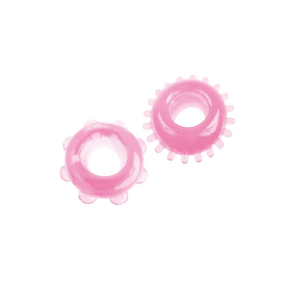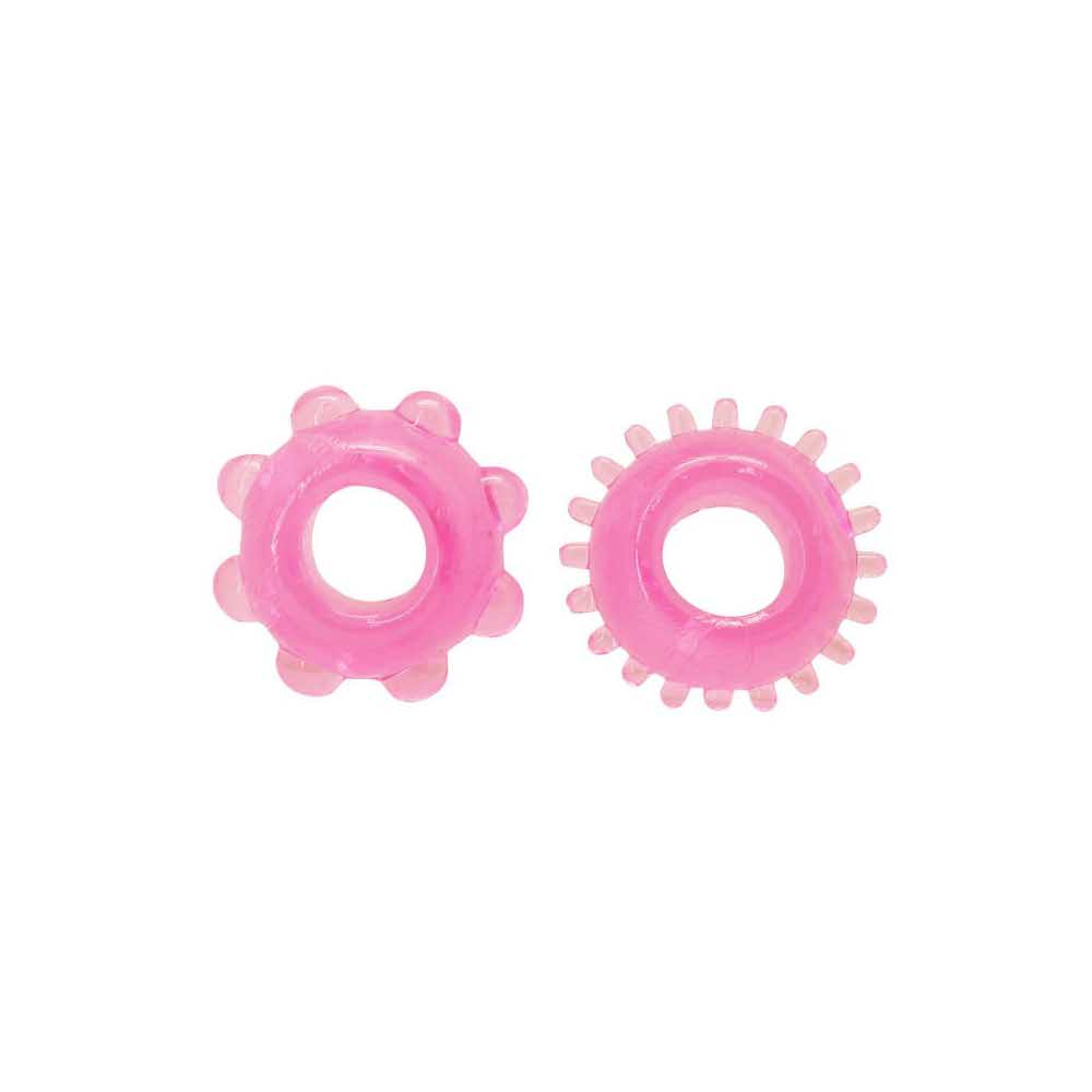 Zestaw 2 elastycznych pierścieni fallicznych z TPE, o różnych kształtach i różowym kolorze. Bez ftalanów.