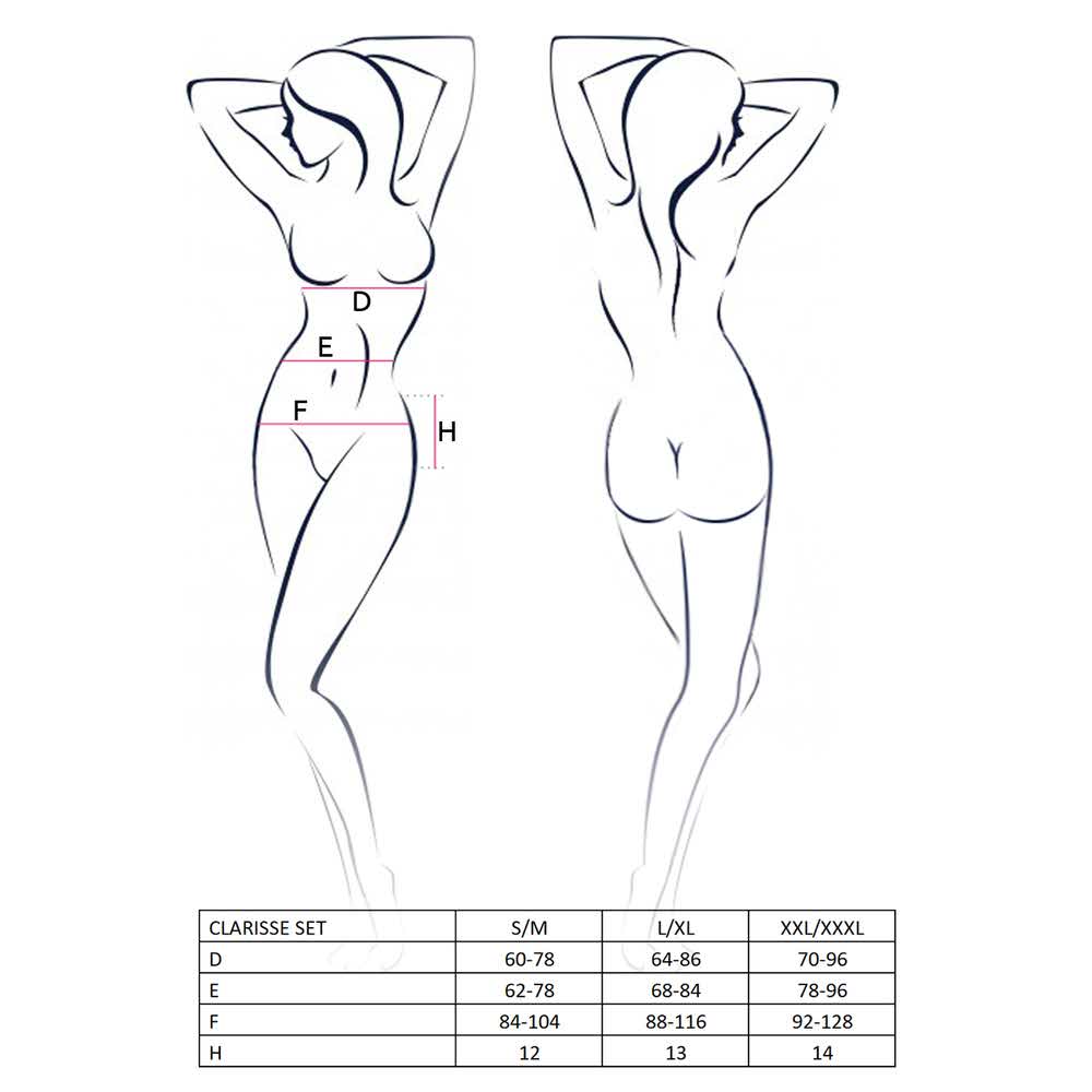 Czy czarny Clarisse set może być klasyczny? Tak, jeśli mówimy o elegancji. Ale czy jednocześnie może być wyzywający i nieprzyzwoicie seksowny? Oczywiście! Biustonosz typu „open bra”, czyli z otwartą częścią biustonosza wzmocniony fiszbinami uwydatnia piersi i podkreśla kobiecy dekolt, z kolei pas i majtki podkreślają kobiecą talię uwypuklając najważniejsze walory kobiecego ciała. Obok takiego kompletu niemożliwym staje się przejść obok niego obojętnie.