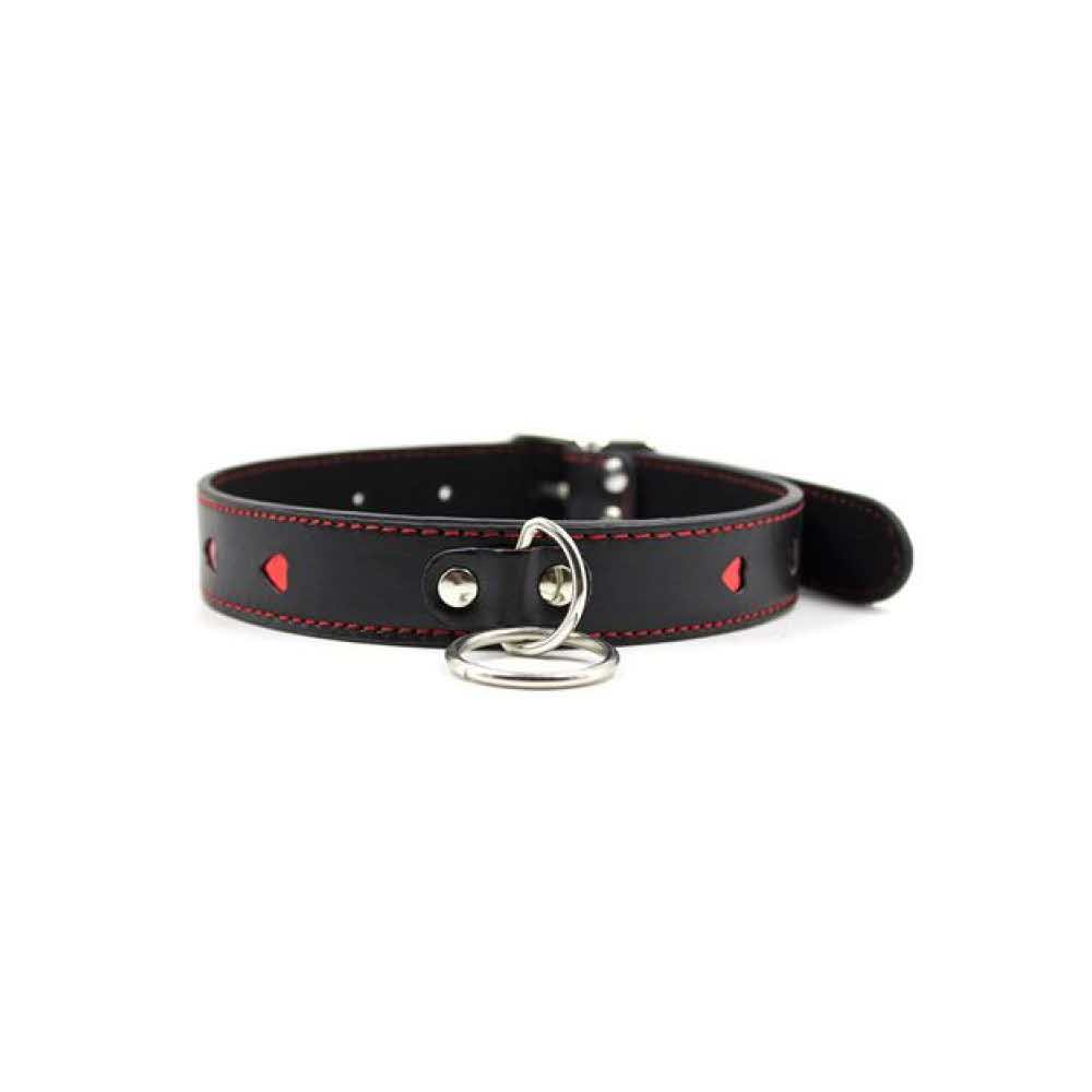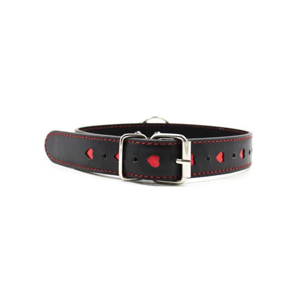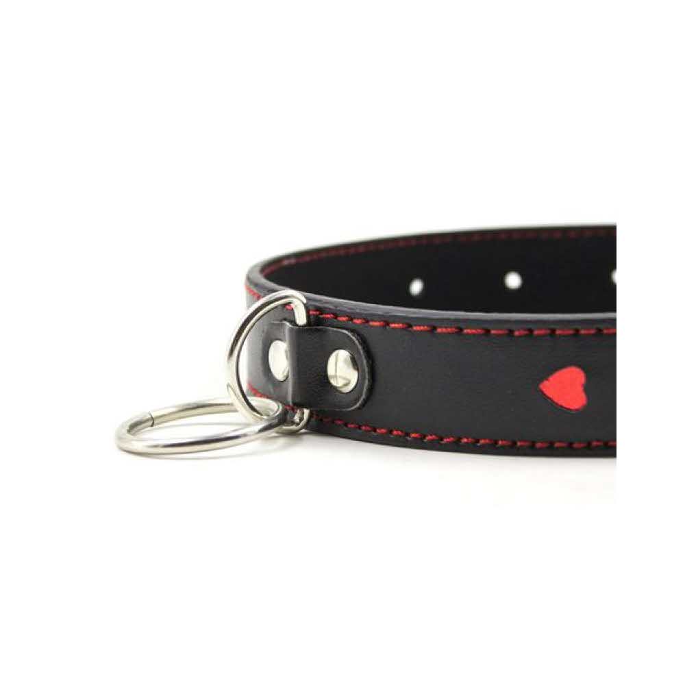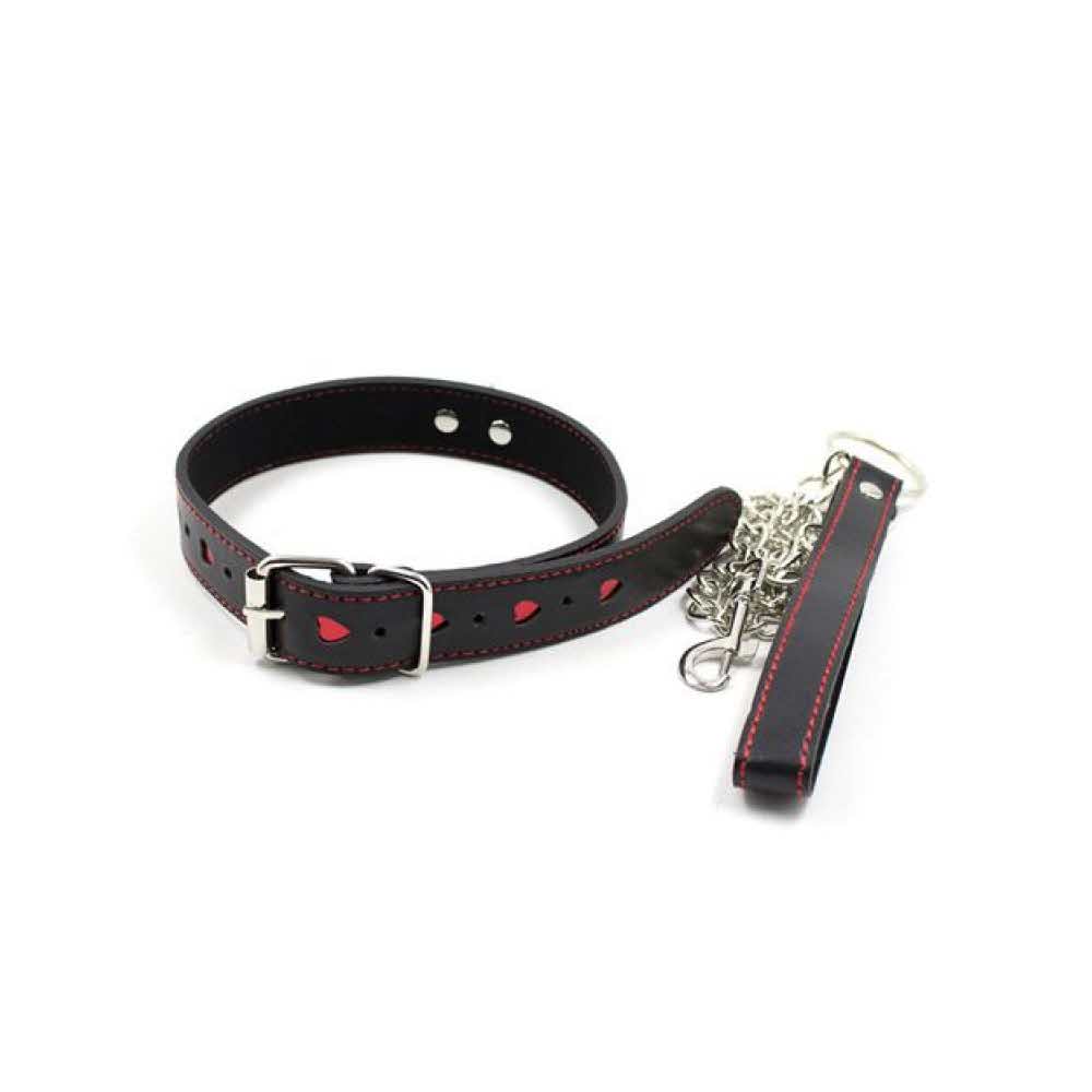 Obszyty sztuczną skórą kołnierz z czerwonymi sercami i metalową smyczą: element niewoli, który spełni twoje najbardziej tajne pragnienia dominacji! Fetish Art od Toyz4Lovers: spełnij swoje najbardziej szalone marzenia!