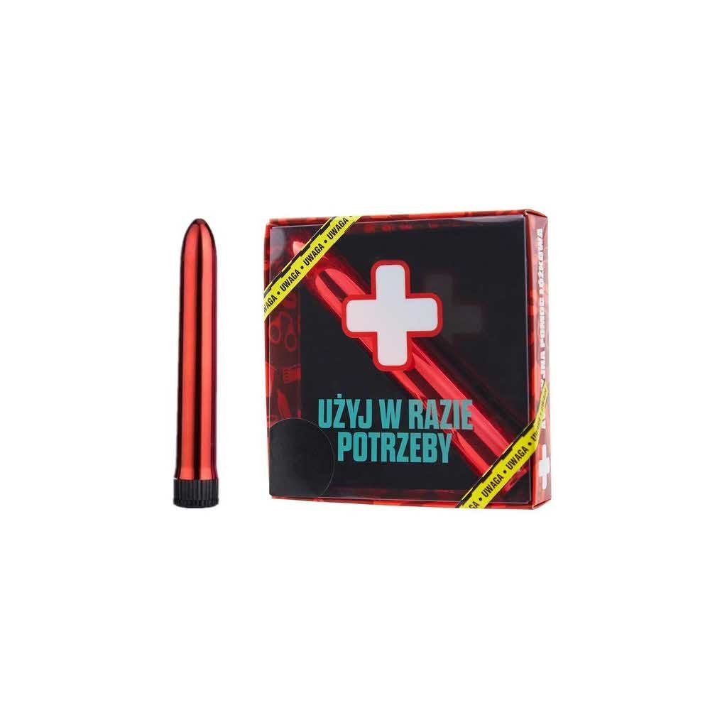 Zabawny gadżet na prezent dla każdej kobiety z poczuciem humoru – niezależnie od wieku! Mały, elegancki wibrator w kolorze czerwonym – pudełko stylizowane na apteczkę pierwszej potrzeby. Z pewnością wywoła mnóstwo śmiechu na imprezie, na której zostanie wręczony, ale UWAGA – wibrator jest prawdziwy, zatem w chwili potrzeby, po prostu dokup jedną baterię AA i wyjmij gadżet z pudełka! Śmieszny upominek, idealny na osiemnaste urodziny lub panieński wieczór.