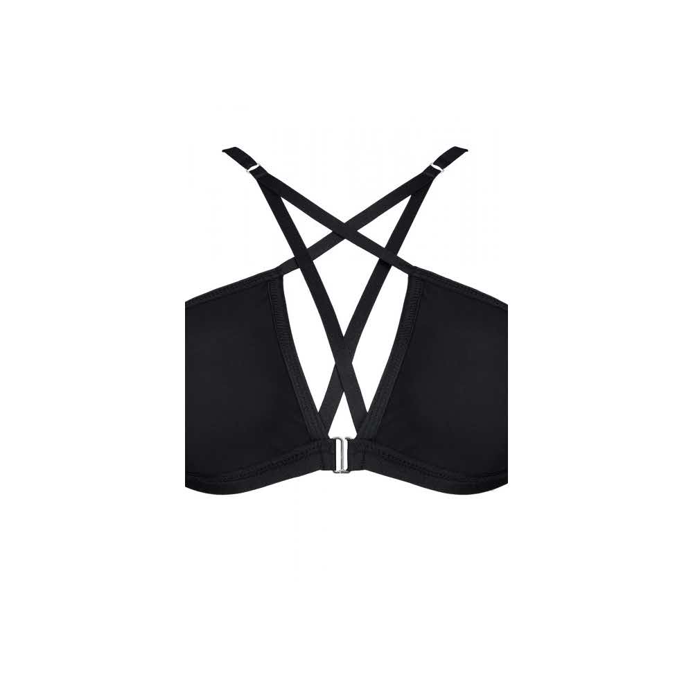Biustonosz z przodu: srebrne, metalowe, ozdobne zapięcie. Uwagę przykuwa stylizowany symbol pentagramu z czarnych gumek. Z tyłu ozdobna kompozycja z gumek ze srebrnymi, metalowymi regulatorami.