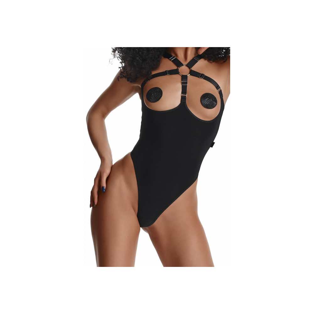 Body z przyjemnego w dotyku i elastycznego materiału w kolorze czarnym. Z przodu przykuwająca uwagę kompozycja z czarnych gumek, połączonych ze srebrnym metalowym kołkiem oraz ozdobnymi regulatorami. Gumki miłe w dotyku z metalicznym połyskiem. Wysoko profilowane wycięcie na biodrach seksownie podkreśla linię pośladków i bioder. Dzięki licznym regulatorom, komplet można idealnie dopasować do ciała.