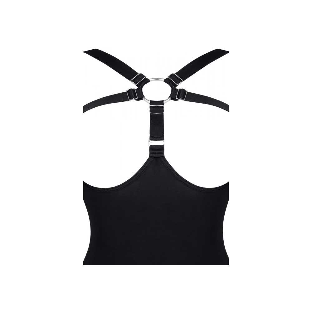 Body z przyjemnego w dotyku i elastycznego materiału w kolorze czarnym. Z przodu przykuwająca uwagę kompozycja z czarnych gumek, połączonych ze srebrnym metalowym kołkiem oraz ozdobnymi regulatorami. Gumki miłe w dotyku z metalicznym połyskiem. Wysoko profilowane wycięcie na biodrach seksownie podkreśla linię pośladków i bioder. Dzięki licznym regulatorom, komplet można idealnie dopasować do ciała.