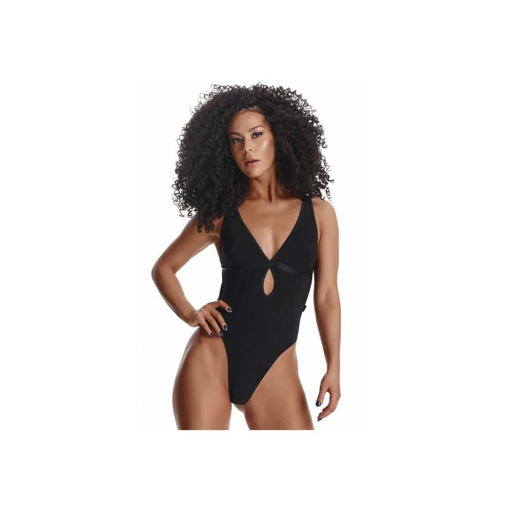 Body z przyjemnego w dotyku i elastycznego materiału w kolorze czarnym. Z przodu efektowny dekolt. Pod biustem wzmocnione poziomą, szeroką czarną gumką z ozdobnym przeszyciem. Pionowe przeszycia pod biustem optycznie wyszczuplają sylwetkę. Z tyłu efektowna kompozycja z gumek i srebrnych, metalowych kółek i regulatorów. Gumki miłe w dotyku i wytrzymałe.