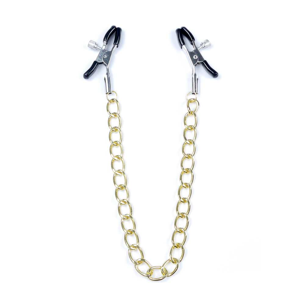 Wytrzymałe metalowe zaciski pokryte miękką gumą, te zaciski są idealne dla początkujących jak i entuzjastów. Siłę zacisku brodawki można regulować obracając śrubę, Elegancki łańcuszek łączy oba sutki, daje to niesamowitą stymulację przy każdym ruchu.