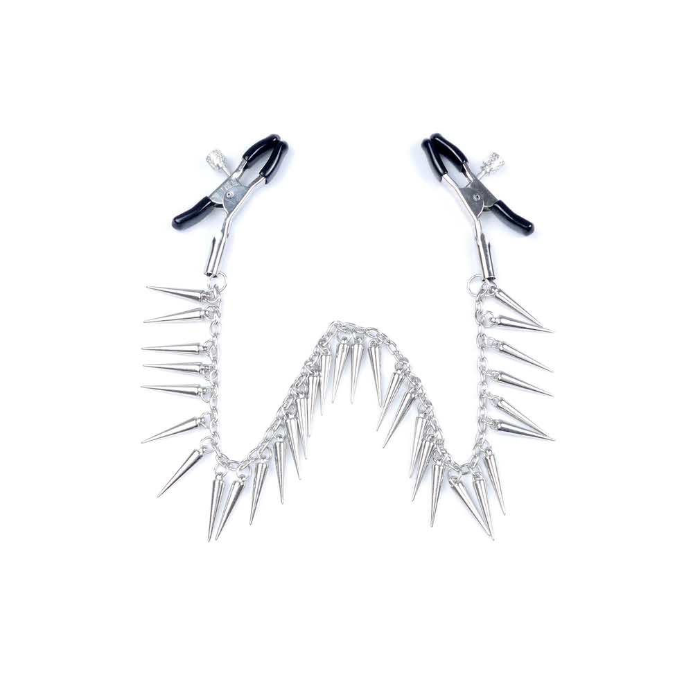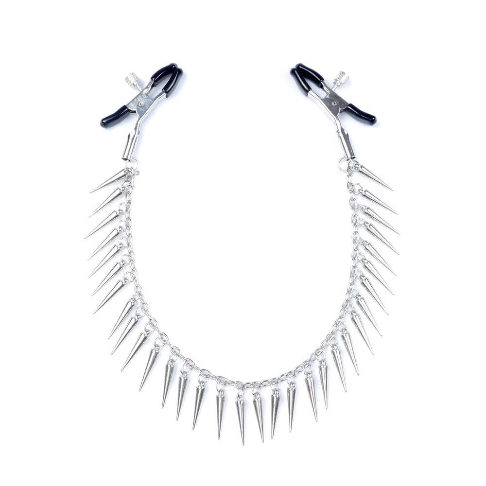 Wytrzymałe metalowe zaciski pokryte miękką gumą, te zaciski są idealne dla początkujących jak i entuzjastów. Siłę zacisku brodawki można regulować obracając śrubę, Elegancki łańcuszek z ozdobamii łączy oba sutki, daje to niesamowitą stymulację przy każdym ruchu.