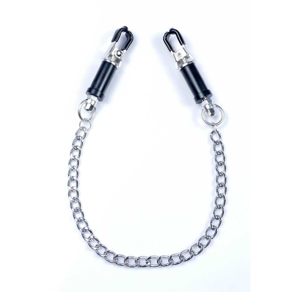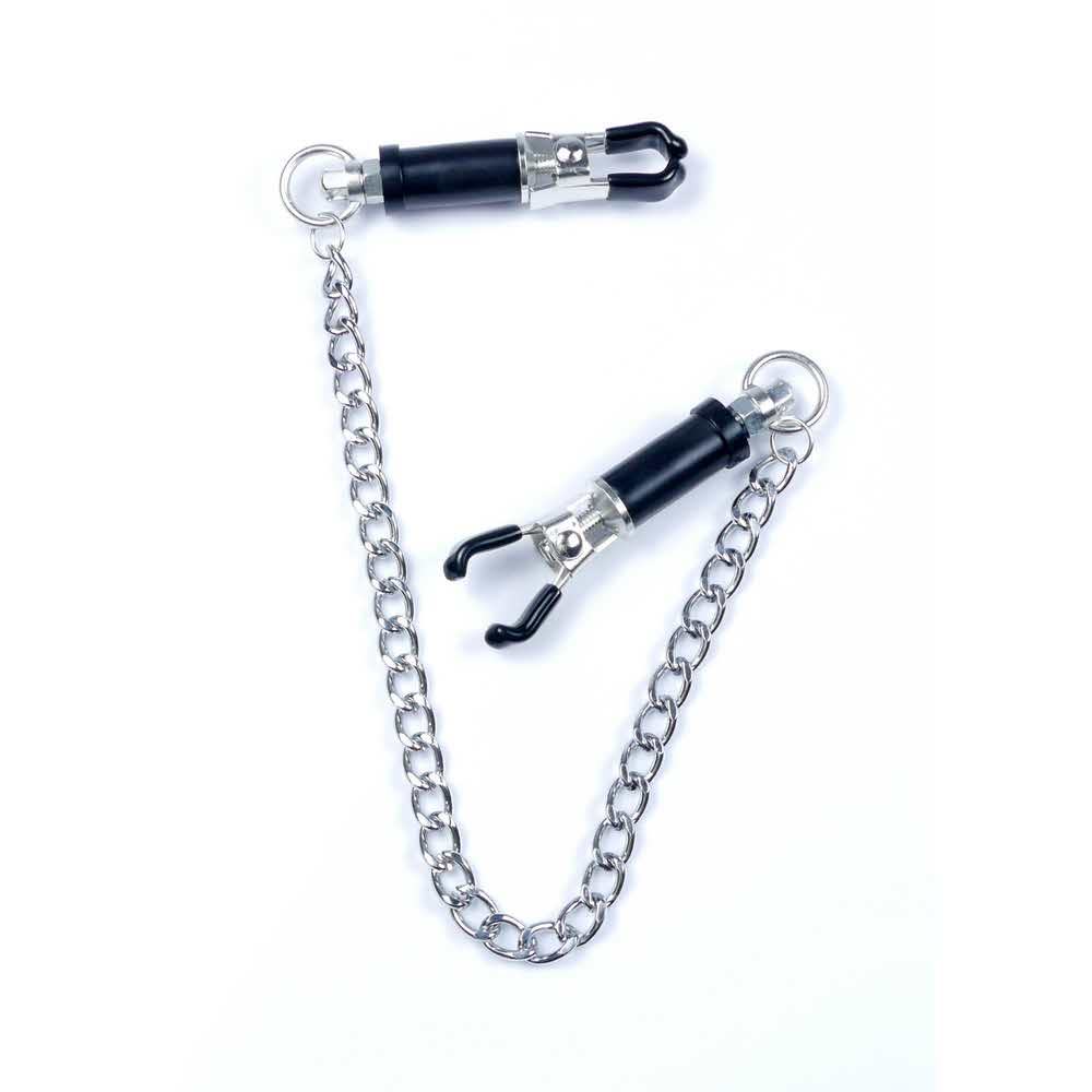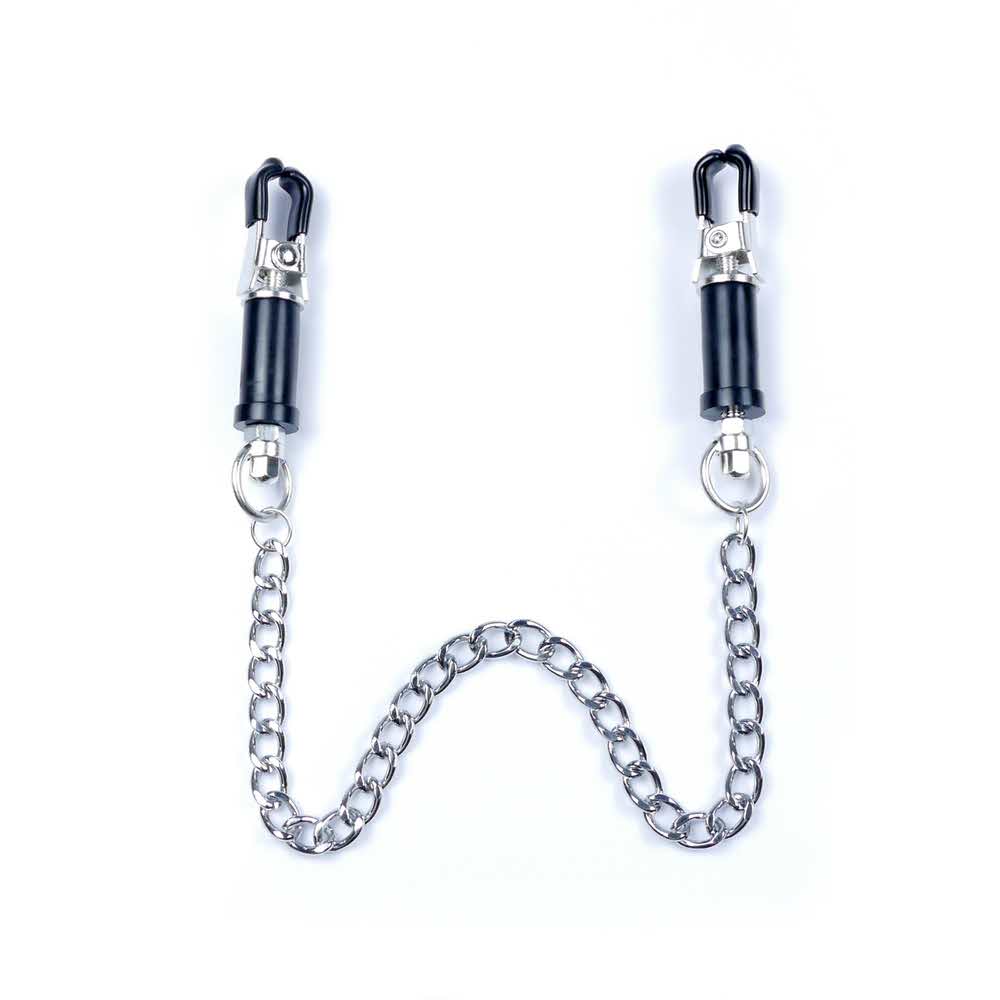 Wytrzymałe metalowe zaciski pokryte miękką gumą, te zaciski są idealne dla początkujących jak i entuzjastów. Siłę zacisku brodawki można regulować obracając górną częścią klamry, Elegancki łańcuszek łączy oba sutki, daje to niesamowitą stymulację przy każdym ruchu.