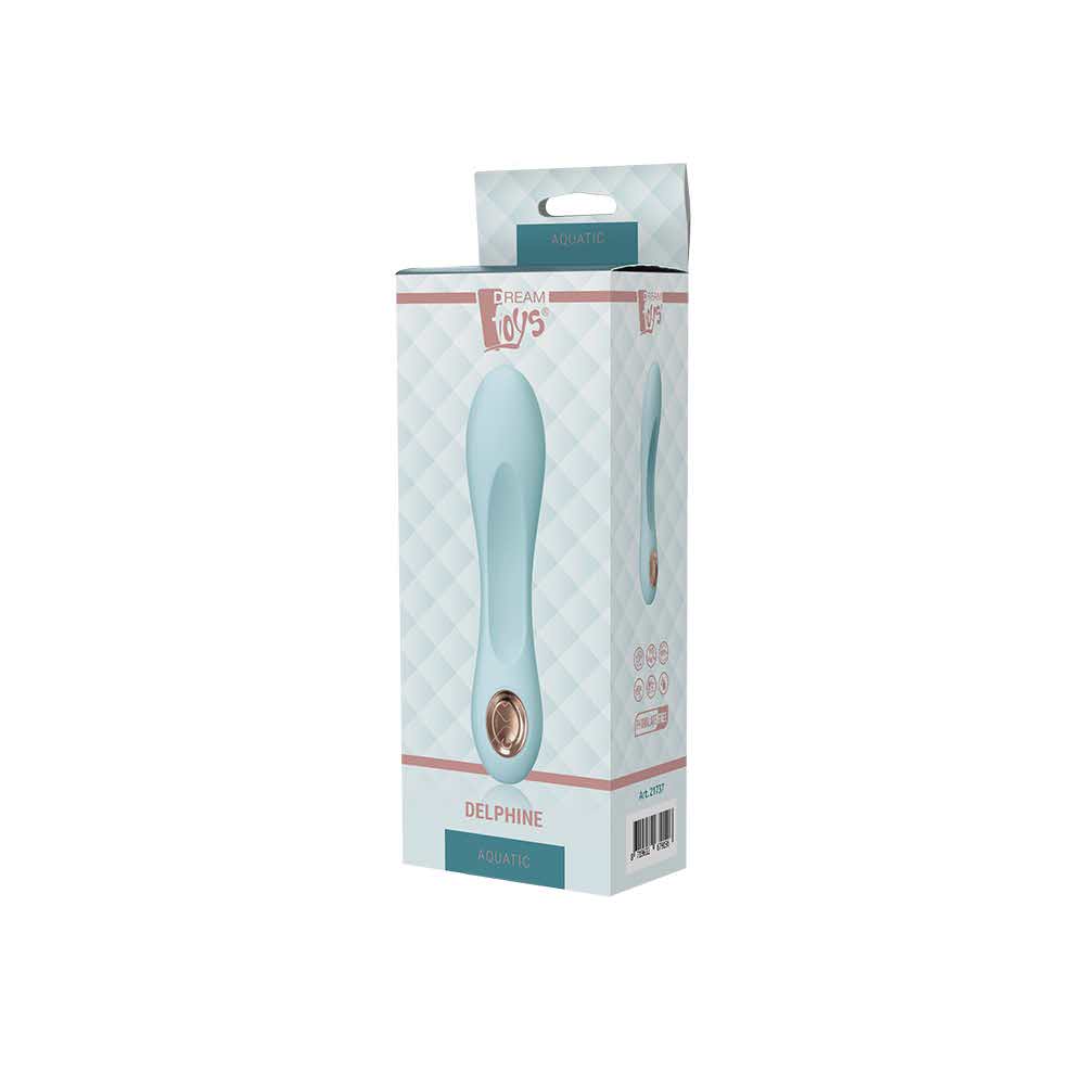 Wibrator Delphine z kolekcji Aquatic firmy Dream Toys ma stylowe guziki w kolorze różowego złota i mocny, wytrzymały kształt oraz miękką końcówkę. Jest wykonany z dwuwarstwowego silikonu i ABS, wodoodporny i bezpieczny dla ciała, nie zawiera ftalanów ani lateksu. Jedna strona wibratora jest teksturowana, druga strona jest gładka z charakterystyczną krawędzią. Dzięki dwuwarstwowemu silikonowi posiada podwójną gęstość: miękką na zewnątrz i twardszą wewnątrz. Mocny silnik Delphines oferuje 7 wzorów wibracji i 3 prędkości. Operację można wykonać za pomocą dwóch przycisków u podstawy. Można go ładować za pomocą dołączonego kabla USB.