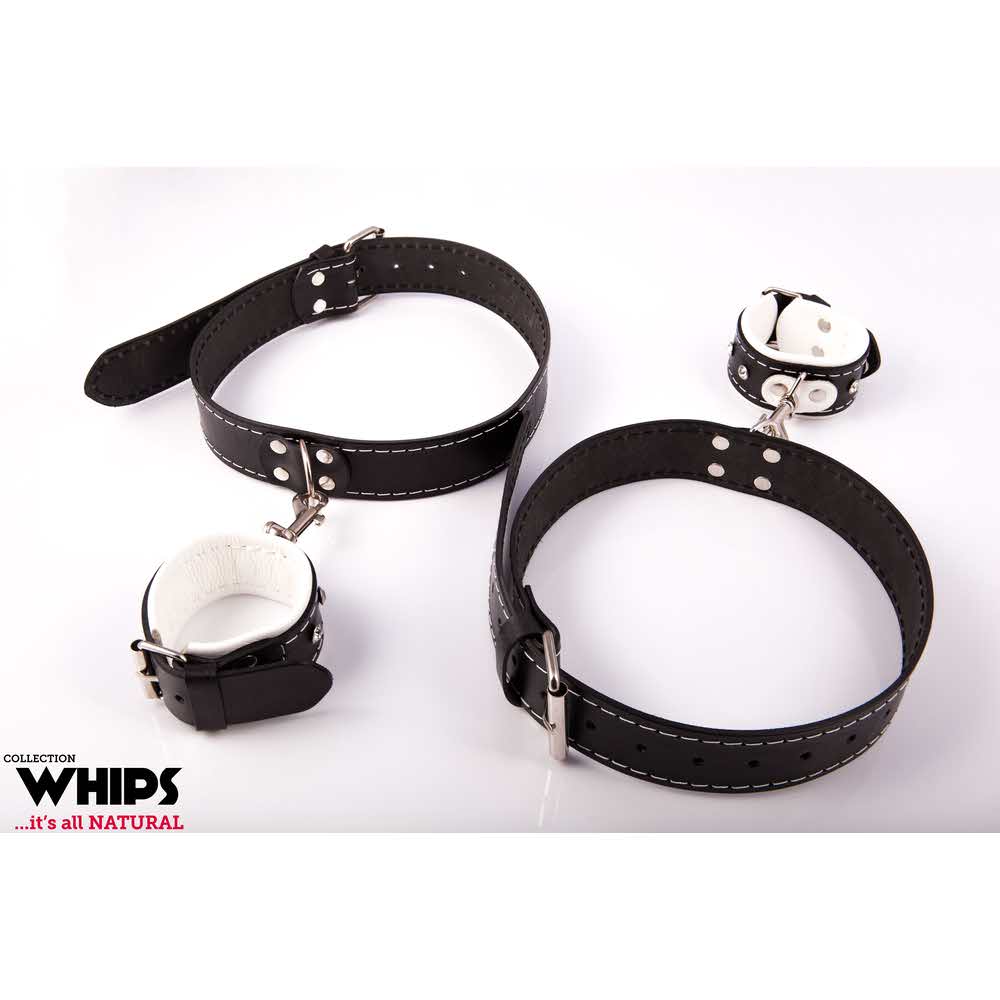 Solidna skórzana uprząż krępująca nadgarstki z udami.