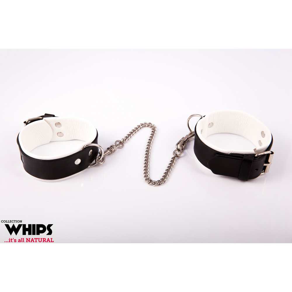 Skórzane kajdanki męskie na nogi w kolorze biało-czarnym zapinane na masywne klamry. Możliwość regulacji rozmiaru.