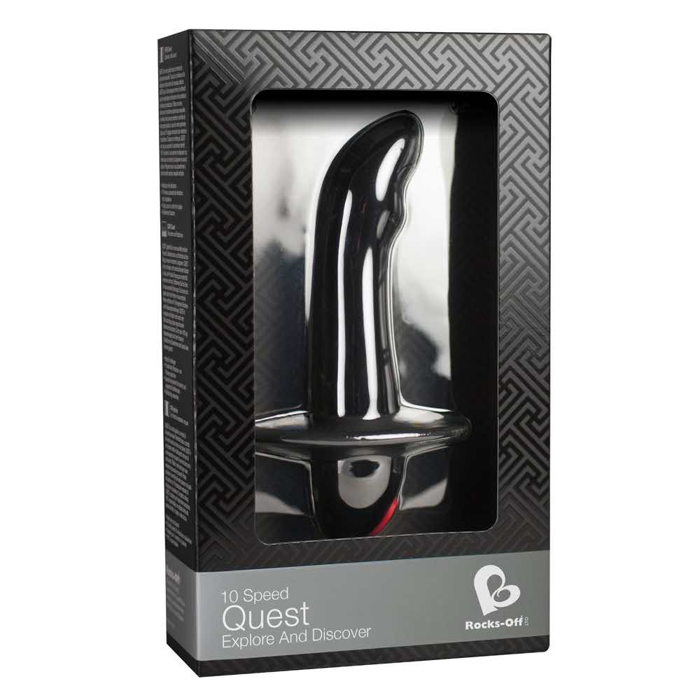 Intensywna wibrująca przyjemność! Ten wibrator prostaty Quest od Rocks Off z lekko zakrzywioną końcówką nieomylnie celuje w jego punkt P i rozpieszcza go intensywnie za pomocą 10 trybów wibracji, które można łatwo kontrolować za pomocą przycisku. Czysta przyjemność! Dołączona bateria. Długość całkowita 11,2 cm, średnica 2,5 cm. Silikon, ABS. Zrównoważone opakowanie bez plastiku.
