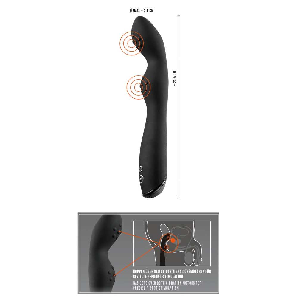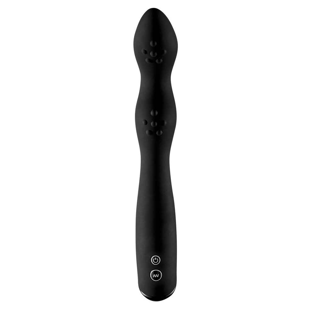 Dla intensywnej przyjemności na zapleczu! Ten wibrator ze sprytnie zakrzywioną końcówką zapewnia ekstatyczną stymulację w kanale przyjemności analnej. 7 zróżnicowanych trybów jest łatwo kontrolowanych za pomocą przycisku, podczas gdy falisty trzon i wypustki zapewniają intensywną dodatkową stymulację w samym punkcie P! Baterie należy zamawiać oddzielnie (2 x AAA). Długość całkowita 23,5 cm, długość wkładki 18 cm, średnica˜ 3,6 cm. Silikon, PU, ABS.