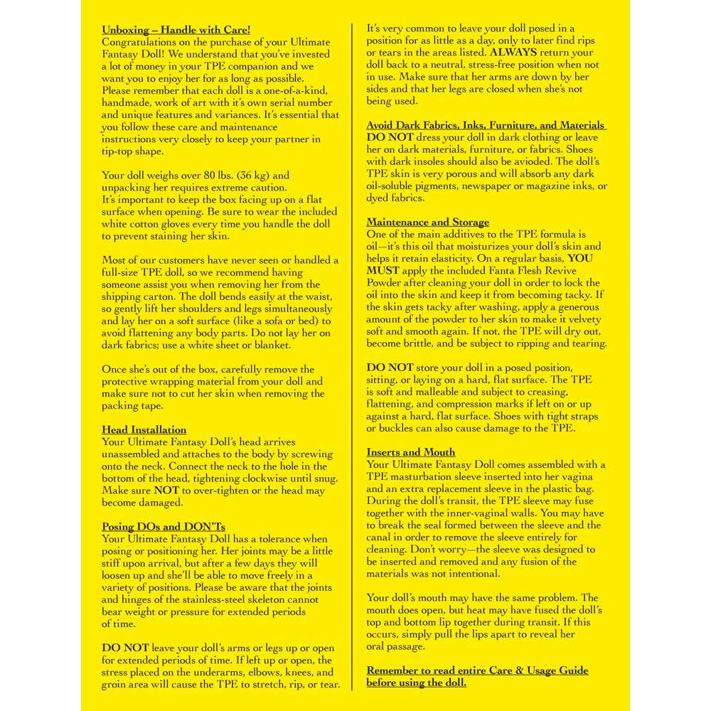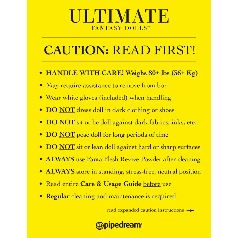 Marzenie o kobiecie! Ta miodowa blond piękność jest niemal nie do odróżnienia od prawdziwej kobiety! To dlatego, że dzięki realistycznej definicji mięśni, elastycznym ramionom i biodrom, Mandy jest najbardziej realistyczną i lekką lalką wśród Ultimate Fantasy Dolls. Dodatkowo, wysportowana Mandy ma twarz 3D z piegami, żywymi zielonymi oczami, długimi rzęsami i pulchnymi ustami. Jej skóra jest wykonana z wysokiej jakości materiału Fanta Flesh i sprawia wrażenie absolutnie realistycznej. Podobnie, pochwa, odbyt i otwory ust są całkowicie prawdziwe w odczuciu. Nawet wargi sromowe są uwodzicielsko realistyczne. Długowłosa blondynka ma wyjątkowo szczupłą sylwetkę i zmysłowy biust z idealnie ukształtowanymi sutkami. Dłonie i stopy są przekonujące dzięki szczegółowemu odwzorowaniu aż po wypielęgnowane paznokcie. Aluminiowy szkielet wewnątrz sprawia, że Mandy jest ruchoma od stóp do głów. Śruby na podeszwach stóp pozwalają piękności stać na własnych nogach. Do lalki dołączona jest szeroka gama akcesoriów: – 1 x Płukanka do czyszczenia – 1 x Ĺadowalny podgrzewacz z kablem USB – 1 x Zestaw bielizny – 1 x Białe bawełniane rękawiczki – 2 x rękawy masturbacyjne TPE – 1 x paski materiału TPE – 1 x 1 zestaw sztucznych paznokci jako zamiennik Instrukcja obsługi znajduje się na zdjęciach. Rozmiar 168 cm. Waga 33 kg. Klatka piersiowa 91 cm, talia 60 cm, biodra 91 cm. Ubrania: XS-S. Rozmiar miseczki D-DD. Rozmiar buta (Euro) 37-38. głębokość wkładki waginalna = analna = oralna 13 cm. Odporny na zachlapanie.