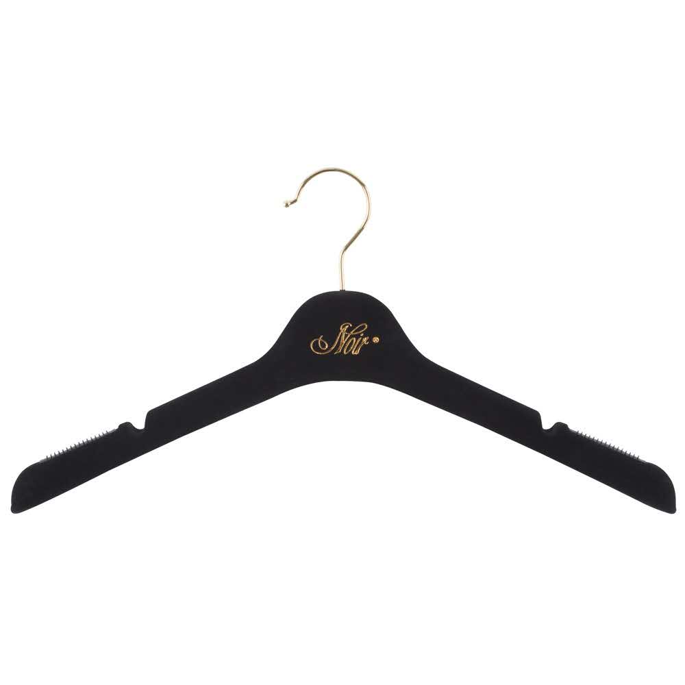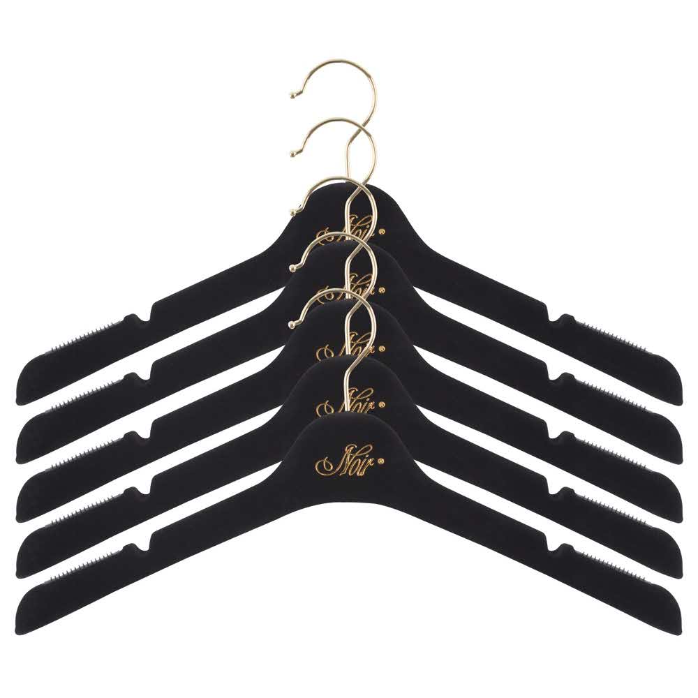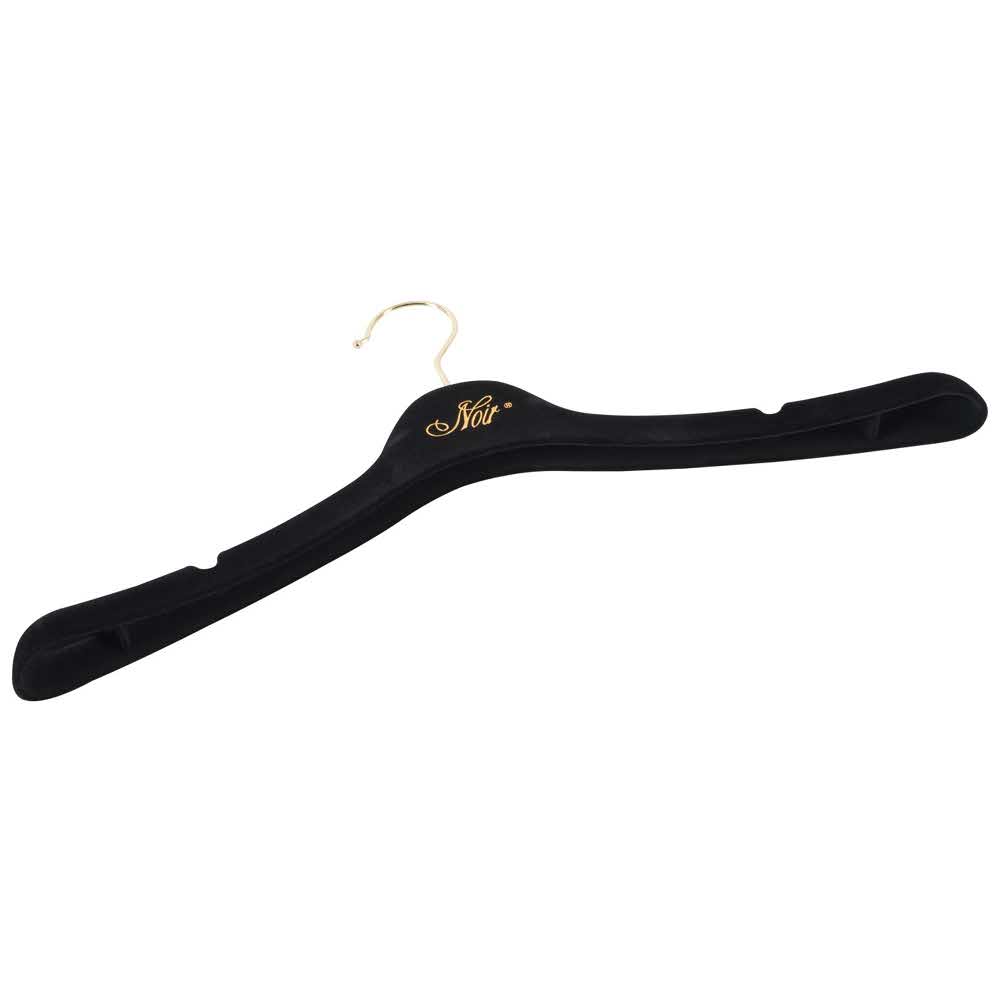 Dla wysokiej jakości prezentacji produktu! Czarny matowy wieszak z nadrukiem NOIR w kolorze złotym i złotym haczykiem o długości 10 cm. Wymiary: 43 cm długości, 14 cm wysokości. 5 sztuk w woreczku.