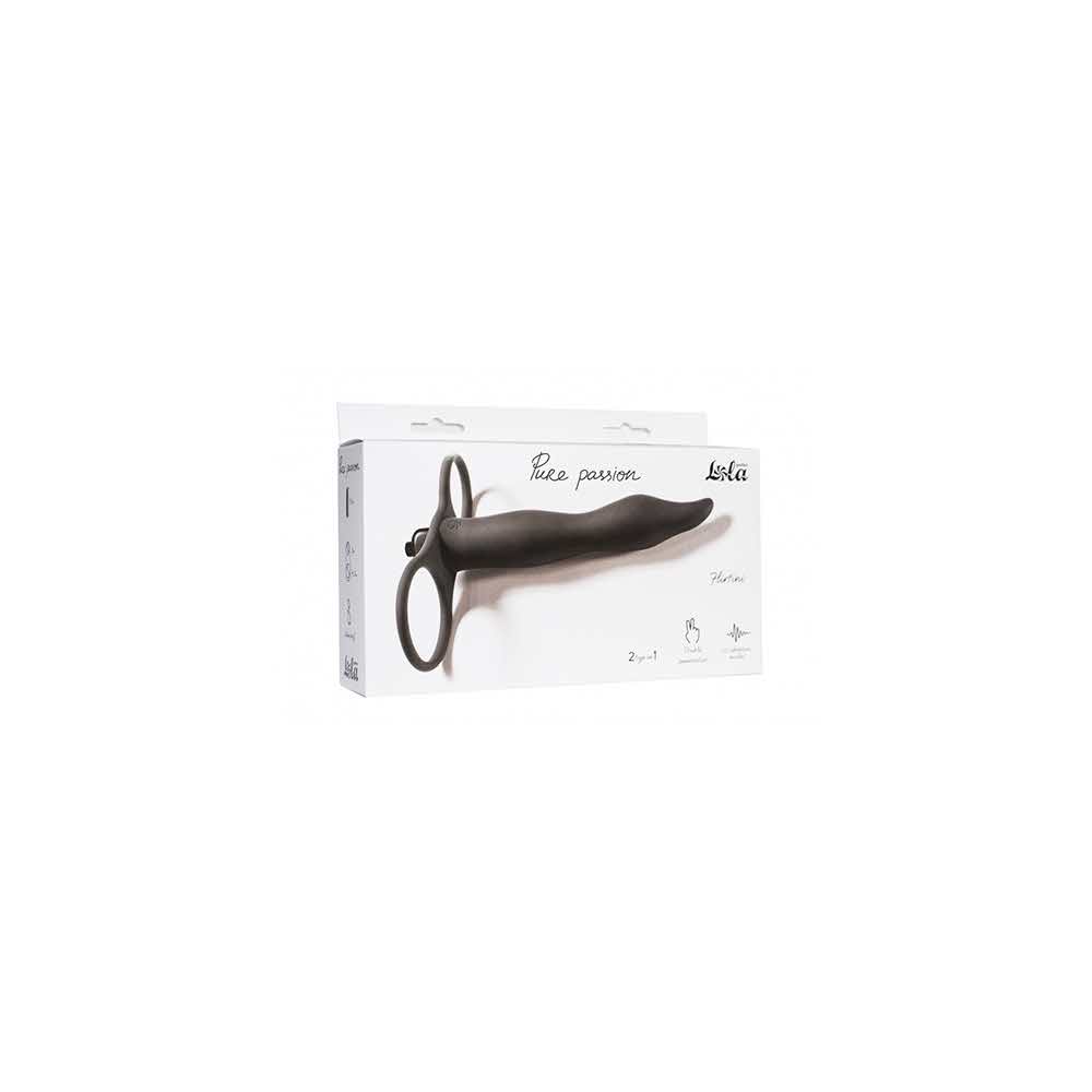 Strap On Flirtini z podwójną penetracją wykonany z hipoalergicznego silikonu. Posiada anatomicznie poprawny i elastyczny kształt. Ma dwa pierścienie, które są przymocowane do podstawy penisa i moszny. Wewnętrzna średnica pierścienia u podstawy penisa wynosi 3 cm, wewnętrzna średnica pierścienia pod moszną wynosi 4,5 cm. Pierścionki dobrze się rozciągają i pasują do każdego rozmiaru. Dodatkową stymulację zapewnia 10-biegowy wibrujący pocisk. Działa na 1 baterię AAA (brak w zestawie). Łatwo zdejmowany z silikonowej końcówki i może być używany samodzielnie.