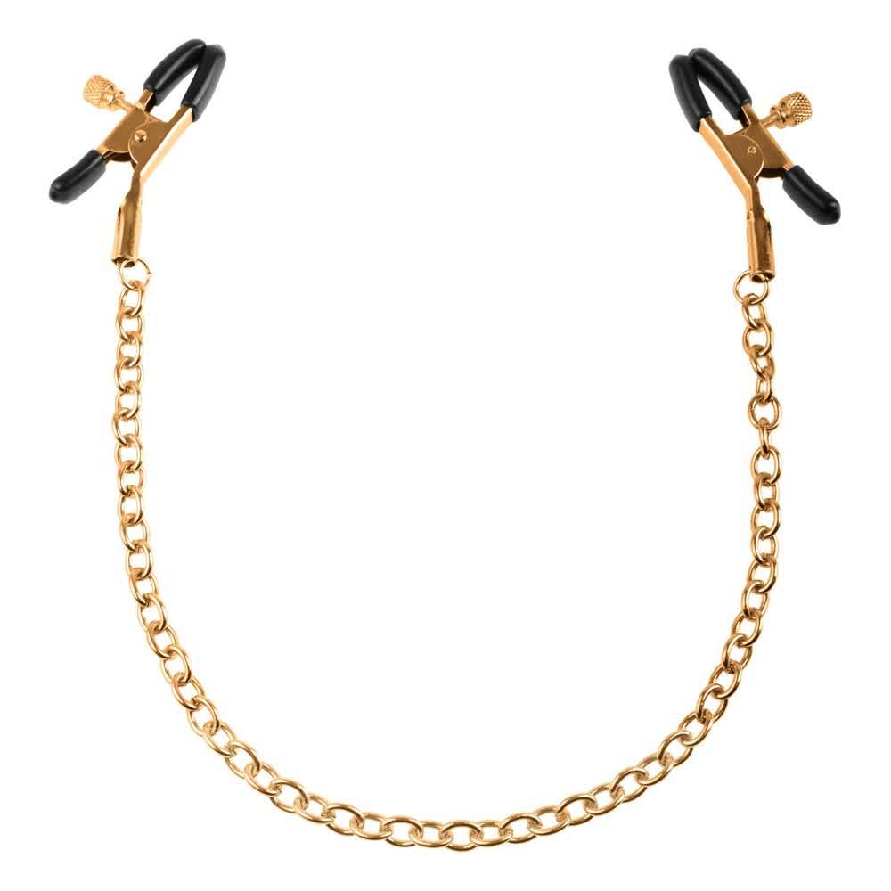 Wytrzymałe metalowe zaciski pokryte miękką gumą, te zaciski są idealne dla początkujących, jak i entuzjastów. Siłę zacisku brodawki można regulować obracając śrubę, Łańcuszek z odważnikiem łączący oba sutki, co daje niesamowitą stymulację przy każdym ruchu.