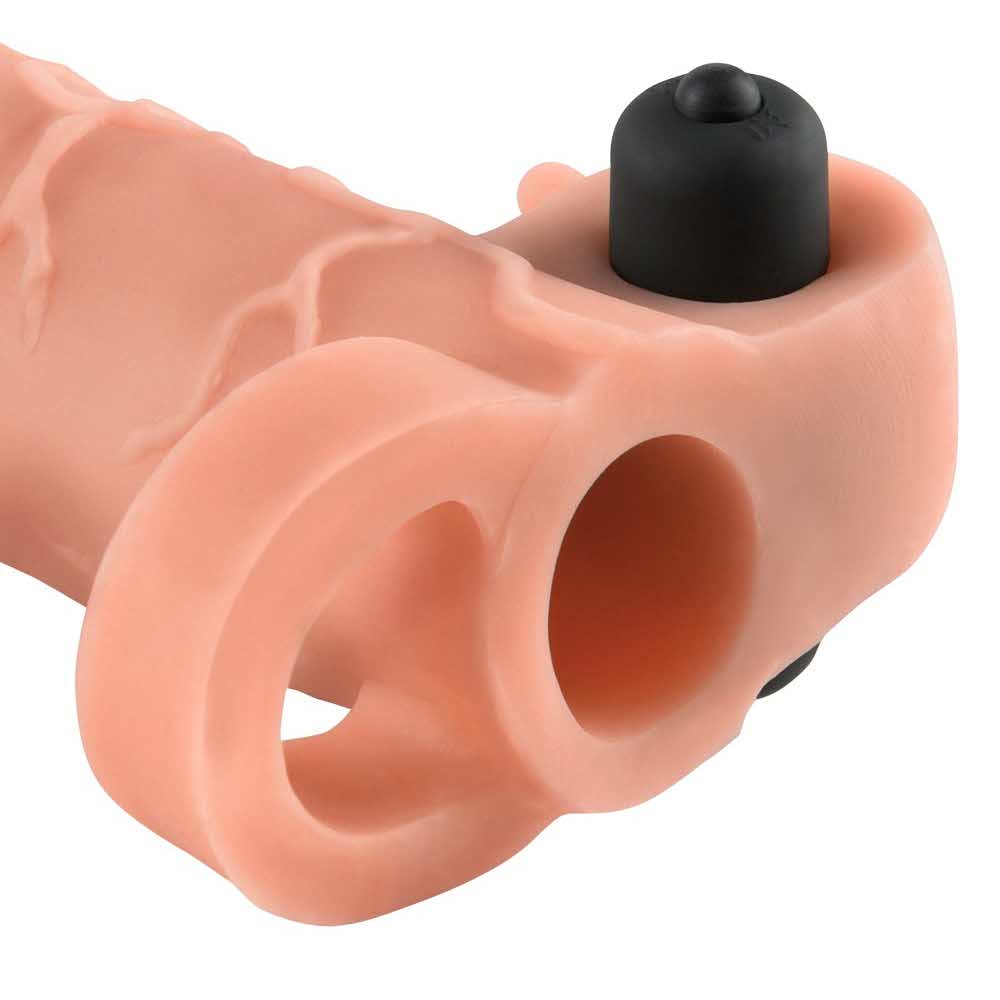 Zagęszcza i wydłuża penisa, zwiększa erekcję i stymulację! Pokrowiec penisa wykonany z miękkiego, przypominającego skórę, rozciągliwego materiału (Fanta Flesh) nadaje penisowi górny kształt dla spełnienia chwil pożądania. Ściśle przylegająca, podtrzymująca erekcję pokrywa jest po prostu wsuwana na penisa we wzwodnym stanie i dzięki pierścieniowi jąder zapewnia pewne, wygodne dopasowanie bez ześlizgiwania się. Dzięki wspaniałej średnicy zewnętrznej, penis jest o 33% większy w obwodzie. A masywne żołądź jest wydłużony o 5,1 cm! Mały, mocny wibrobullet jest wkładany do górnej pętli i zapewnia ekscytujące mrowienie dodatkowej stymulacji. Nawet w wannie lub pod prysznicem, bo jest wodoodporny! Wraz z baterią (3 x LR44) do wibrobulletu. Długość całkowita płaszcza 16,5 cm, długość wkładki 10,7 cm, szerokość 4,5 cm, średnica wewnętrzna 2,5 cm. Pierścień testowy średnica rozciągliwy. TPE, ABS.