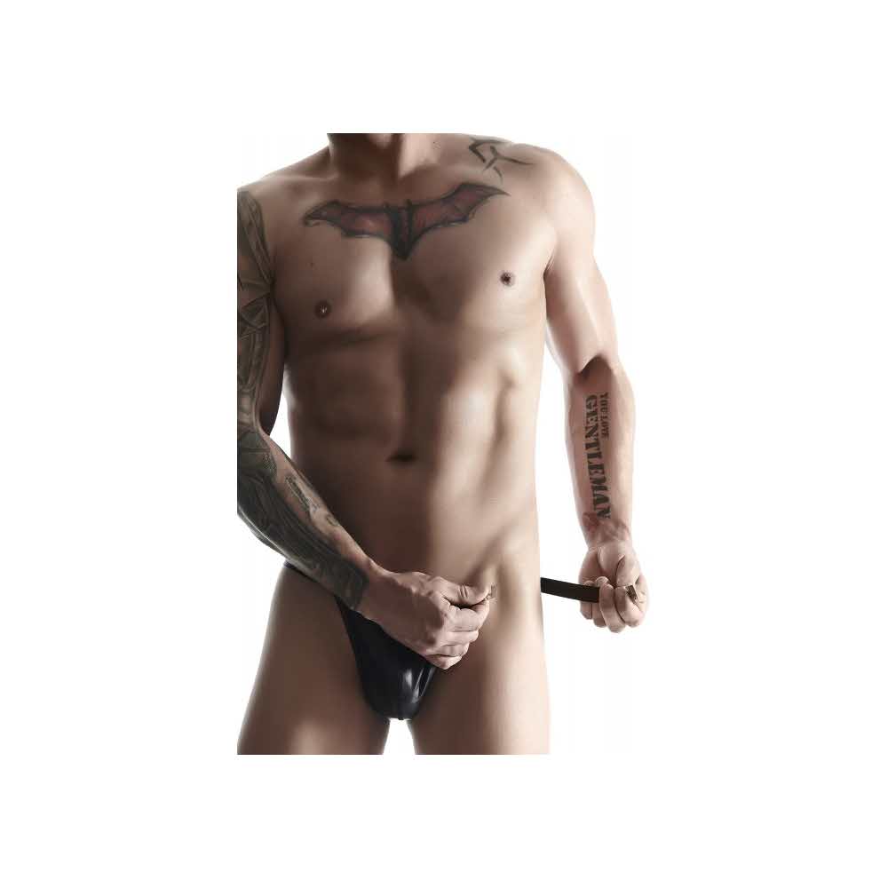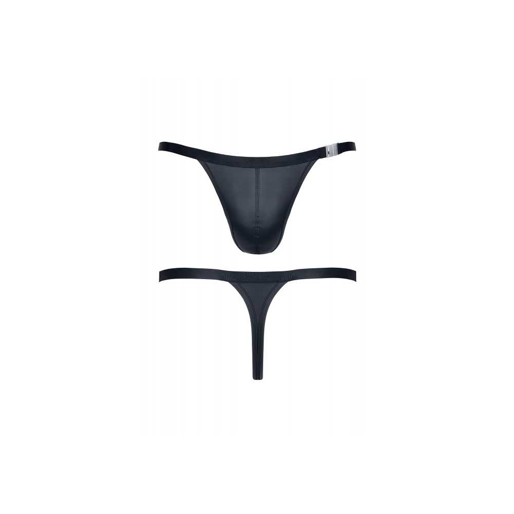 męskie stringi z wetlooka z ozdobnym zapięciem z przodu. Cechy szczególne: