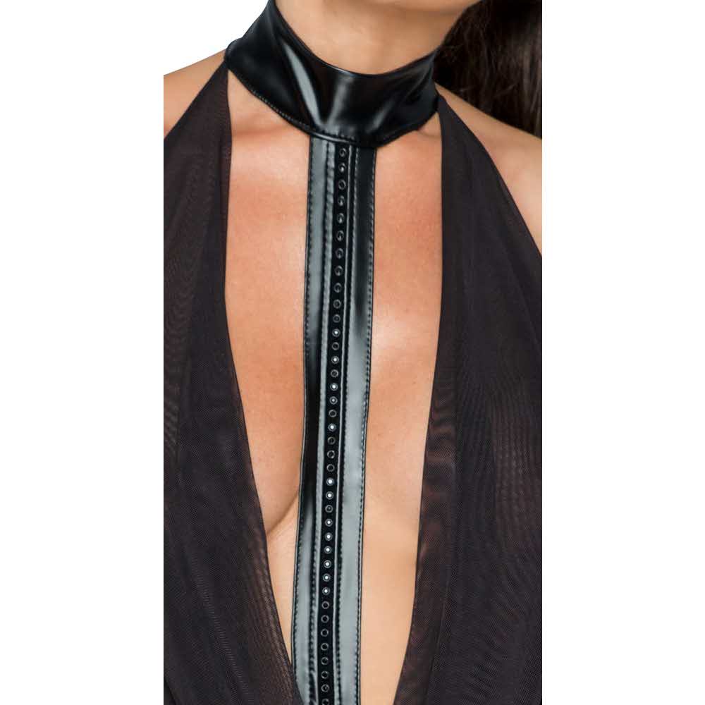 Ekstrawagancki styl dla prowokujących wystąpień! Mocno wycięta minisukienka z matowego, błyszczącego materiału powerwetlook z rozkloszowaną, przezroczystą górą z powernetu. Przód ozdobiony jest błyszczącymi kamieniami i zakończony paskiem na szyję z zapięciem na haftkę. Z tyłu sukienka oferuje cudowny widok nagich pleców, jedynie pośladki są zakryte przez spódnicę. Powernet 93% poliester, 7% spandex powerwetlook 76% poliester, 24% spandex, powłoka polimerowa. Dla tej marki istnieje osobna tabela rozmiarów.