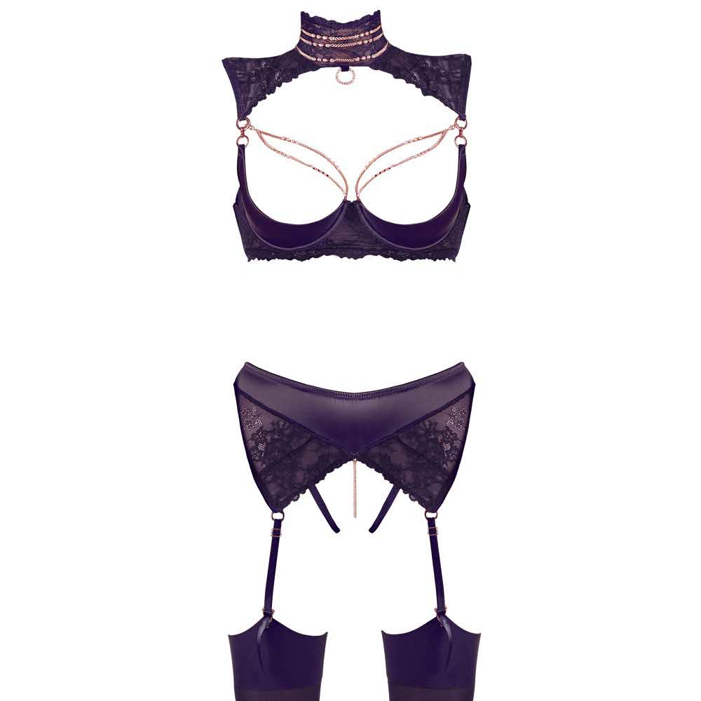 Wyrafinowany przyciągacz wzroku dla zmysłowych chwil! Uwodzicielski duet Abierta Fina. Podniesienie biustu z lekko usztywnianymi miseczkami na fiszbinach w nietypowym wzorze. Ozdobne koronkowe wstawki biegną razem nad ramiączkami, tworząc duży kołnierz. Elementy w kolorze różowego złota umiejętnie podkreślają dekolt i zmysłowo drażnią waginę przy każdym ruchu w kroku. Wszystkie elementy można zdjąć za pomocą małego karabinka. Stringi do pończoch zachwycają również otwartym kroczem i satynowymi wstążkami nad zapięciami 4 szelek. 94% poliester, 6% elastan koronka 90% poliamid, 10% elastan. Bez pończoch.