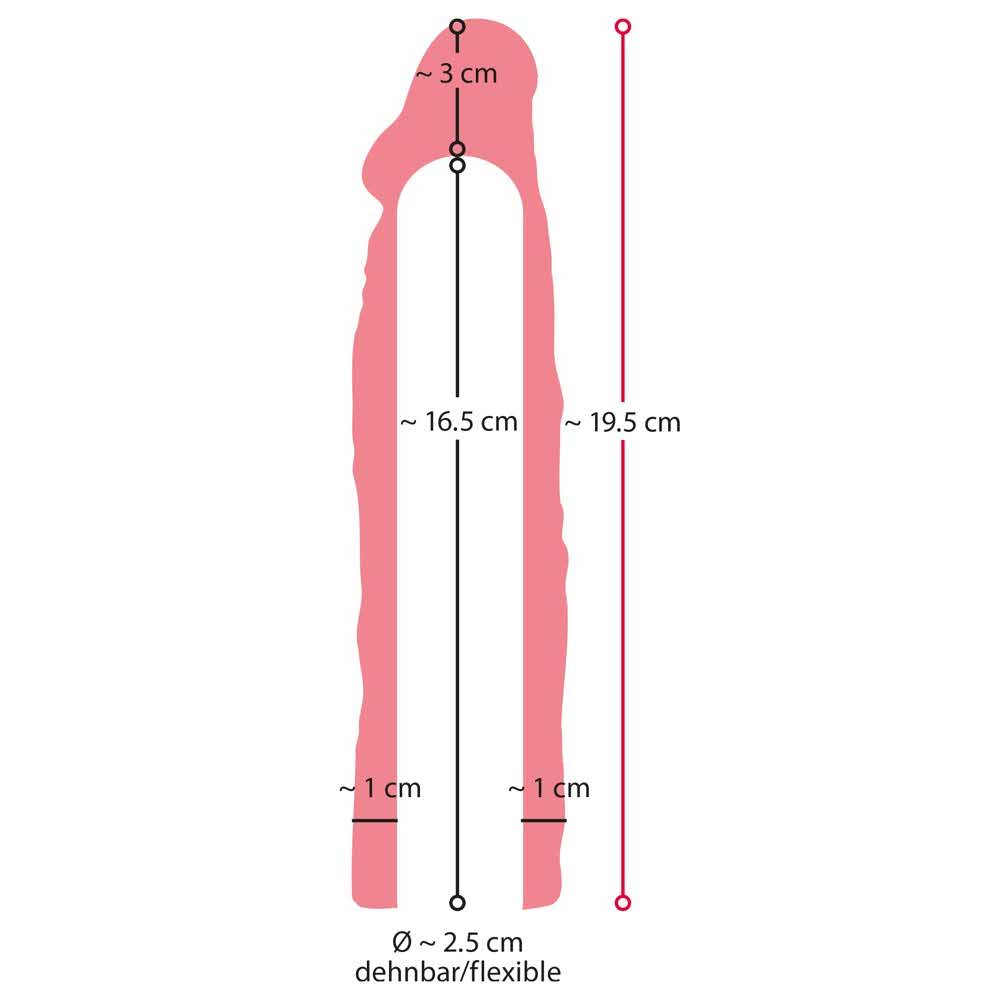 Dla wspaniałych erekcji! Wrażliwy rękaw z pulchną żołędzią i wyraźnym żyłkowaniem. Wspiera męską wytrzymałość dzięki ciasnemu dopasowaniu, poszerza penisa o około 2 cm i wydłuża go o 3 cm. Długość całkowita 19,5 cm, głębokość wprowadzenia 16,5 cm, średnica wewnętrzna 2,5 cm. TPR.