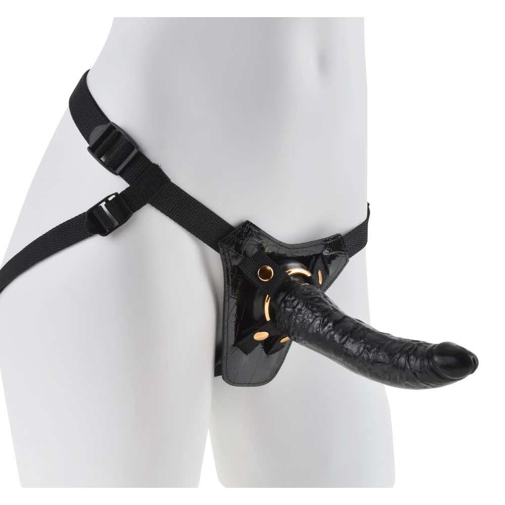 Zabierzcie ją, żeby ją rozpieszczać! Pasek regulowany rozmiarami z wyjmowanym dildo. Dildo w naturalnym wyglądzie penisa z odsysającą stopą – może być również używany solo, a nawet wolnostojący. Pasek w szlachetnej, wężowej skórze z detalami w złotym kolorze jest regulowany w wielu różnych rozmiarach: Obwód bioder do 112 cm, paski ud do 102 cm obwodu każdego z nich. Dildo 19 cm długości, średnica 4,5 cm. PVC, poliamid.