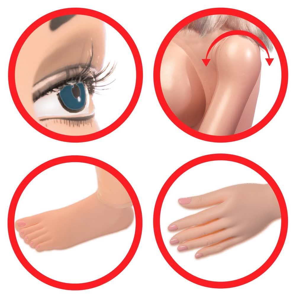 Piękno z wszystkimi dodatkami! Ta kochana lalka zmysłowo patrzy na widza swoją uwodzicielską, trójwymiarową twarzą i długimi, brązowymi włosami. Dłonie i stopy są również ukształtowane i zapraszają do głaskania, a perkusyjne, duże piersi z jędrnymi brodawkami sutkowymi urzekają. Dwa kanały rekreacyjne umieszczone są w masturbatorze, który jest zdejmowany i ułatwia czyszczenie. Jest to zorganizowane od wewnątrz. Twoje usta są również gotowe na satysfakcjonujące chwile wytchnienia. Winyl, TPR, poliester.