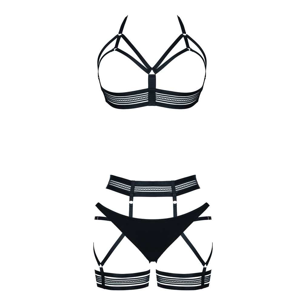 Komplet z przyjemnego w dotyku, elastycznego materiału. Miłe w dotyku, wytrzymałe gumki. Trwałe, ozdobne metalowe elementy w kolorze srebrnym. Biustonosz z przodu: otwarty, z efektowną kompozycją z gumek oraz ozdobną gumką na obwodzie w dolnej części. Z tyłu ozdobna kompozycja z gumek ze srebrnymi, metalowymi regulatorami. Stringi z przyjemnego, elastycznego materiału. Pas do pończoch z pięknymi kompozycjami z gumek i elementami ozdobnymi. Z tyłu czarne gumki zmysłowo podkreślają kształt pośladków. Dzięki licznym regulatorom, komplet można idealnie dopasować do ciała. Pudełko spersonalizowane ze zdjęciami produktu.