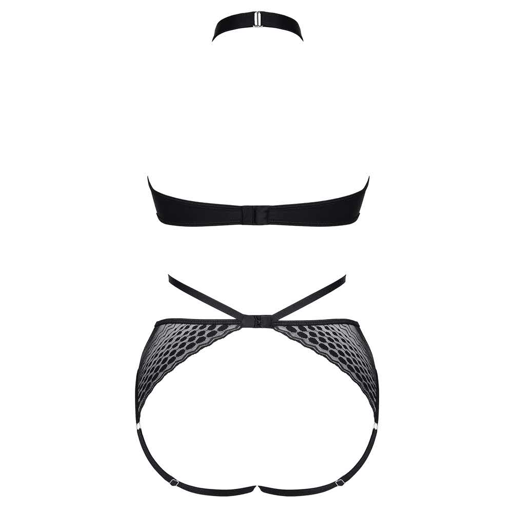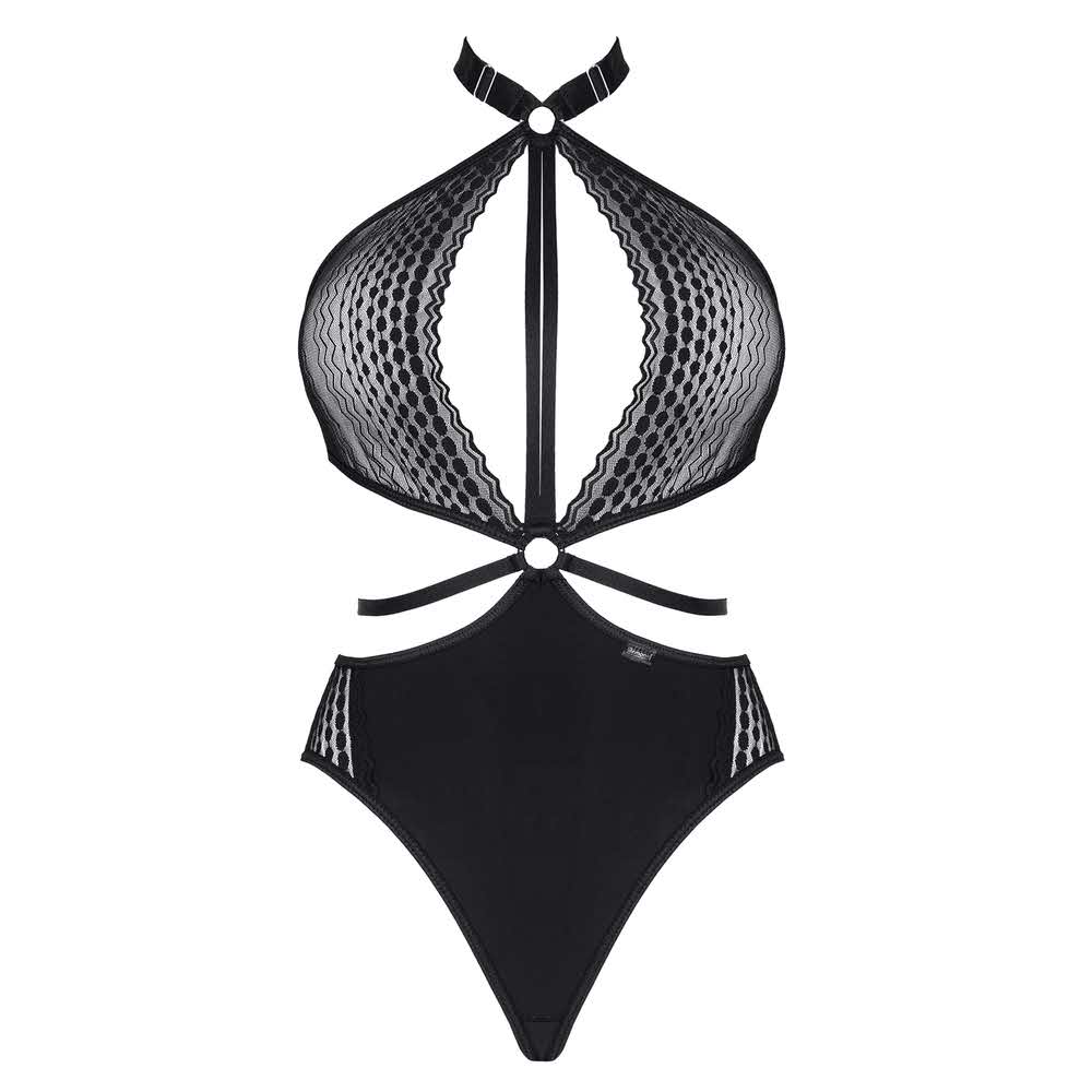Body z przyjemnego w dotyku i elastycznego materiału w kolorze czarnym. Z przodu przykuwająca uwagę kompozycja z czarnych gumek, połączonych ze srebrnymi, metalowymi kółkami i regulatorami oraz elastyczną koronką w geometryczne wzory. Gumki miłe w dotyku z metalicznym połyskiem. Wysoko profilowane wycięcie na biodrach seksownie podkreśla linię bioder. Wysoko profilowane wycięcie na biodrach seksownie uwydatnia linię bioder. Z tyłu efektowne gumki zmysłowo podkreślają kształt pośladków. Pudełko spersonalizowane ze zdjęciami produktu.