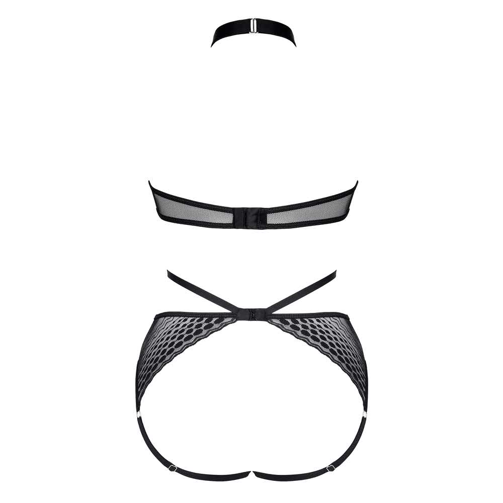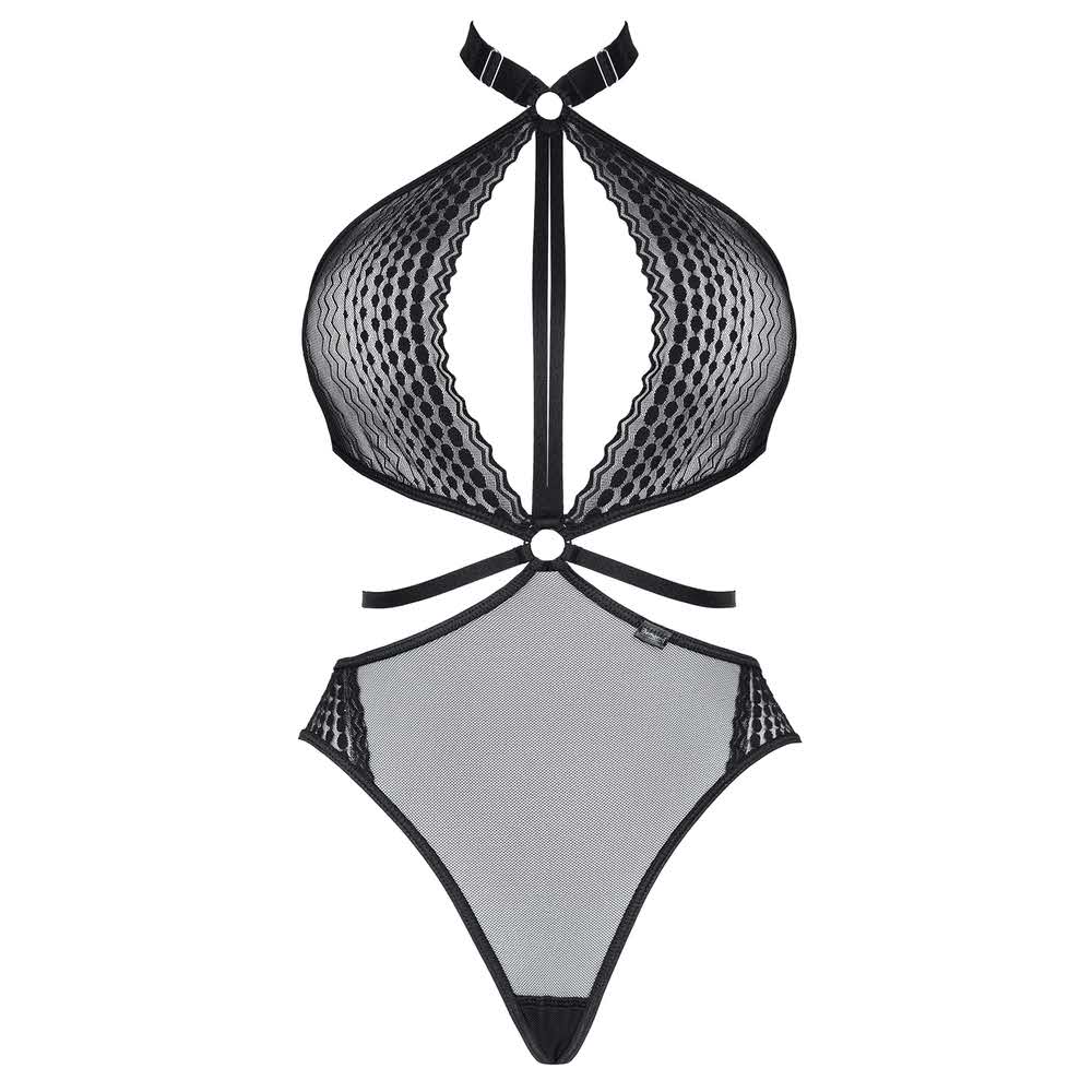 Body z miłej w dotyku, elastycznej i transparentnej siateczki. Z przodu przykuwająca uwagę kompozycja z czarnych gumek, połączonych ze srebrnymi, metalowymi kółkami i regulatorami oraz elastyczną koronką w geometryczne wzory. Gumki miłe w dotyku z metalicznym połyskiem. Wysoko profilowane wycięcie na biodrach seksownie seksownie uwydatnia linię bioder. Z tyłu efektowne gumki zmysłowo podkreślają kształt pośladków. Pudełko spersonalizowane ze zdjęciami produktu.