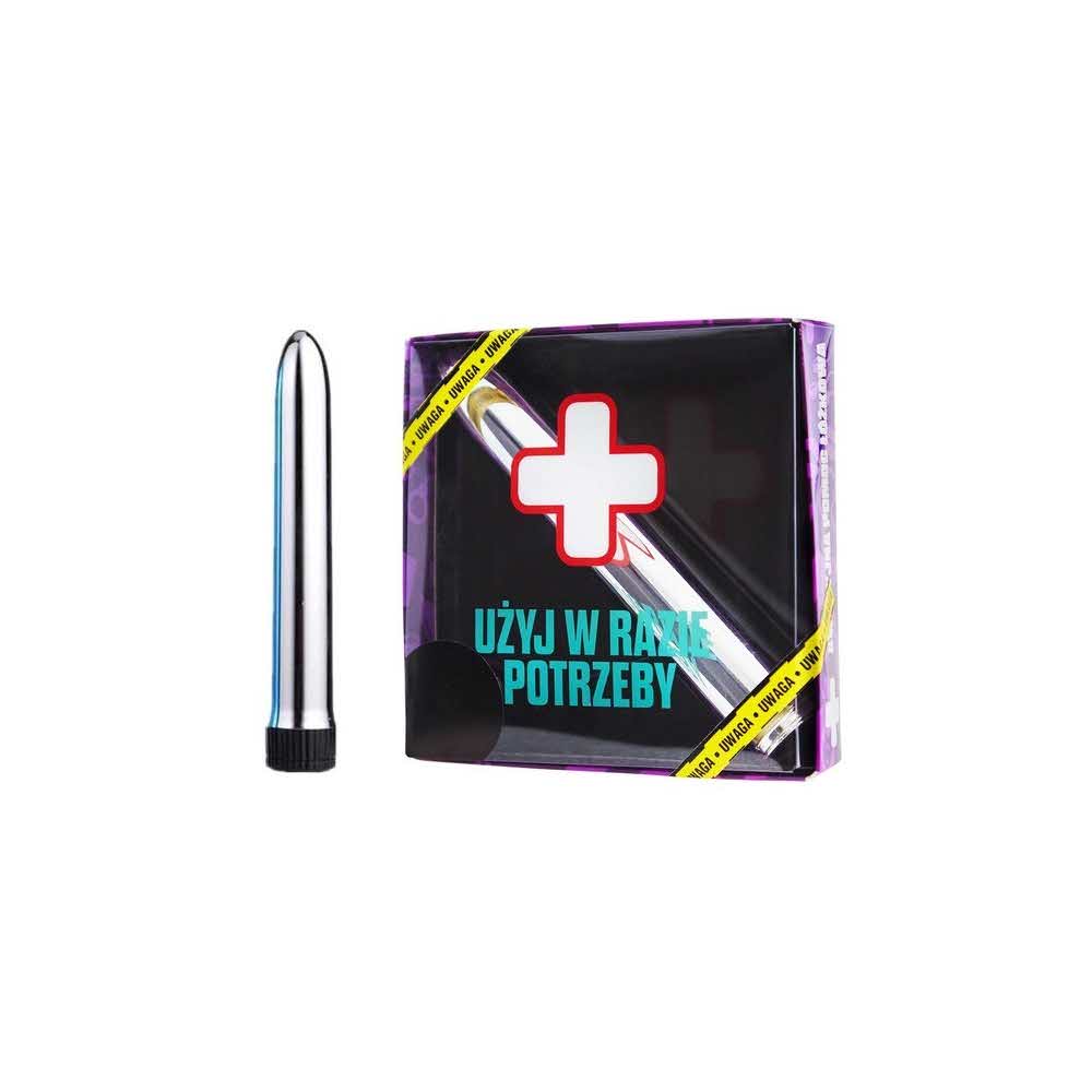 Zabawny gadżet na prezent dla każdej kobiety z poczuciem humoru – niezależnie od wieku! Mały, elegancki wibrator w kolorze srebrnym – pudełko stylizowane na apteczkę pierwszej potrzeby. Z pewnością wywoła mnóstwo śmiechu na imprezie, na której zostanie wręczony, ale UWAGA – wibrator jest prawdziwy, zatem w chwili potrzeby, po prostu dokup jedną baterię AA i wyjmij gadżet z pudełka! Śmieszny upominek, idealny na osiemnaste urodziny lub panieński wieczór.