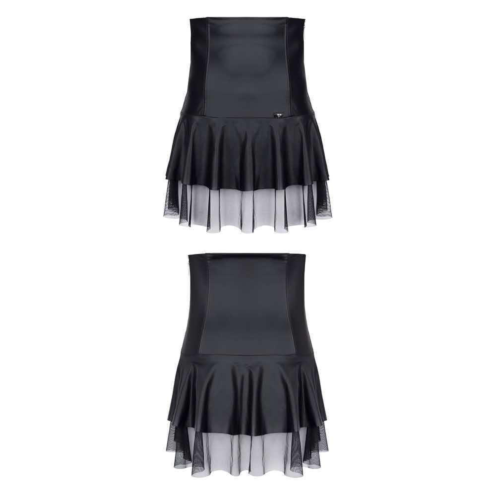 Spódniczka z elastycznego, czarnego materiału typu wetlook. Z boku ozdobny, srebrny ekspres uławiający zakładanie. Z dołu ozdobna linia z czarnej, siateczki. Spódniczka wyróżnia się podwyższonym do piersi stanem. Dodatkowo pod spodem z przodu i z tyłu, zostały ukryte elementy wzmacniające, dzięki którym sukienka wygląda dokładnie jak na zdjęciach. Zmysłowo podkreśla sylwetkę. Doskonała do zabaw dzięki dostępowi z dołu.