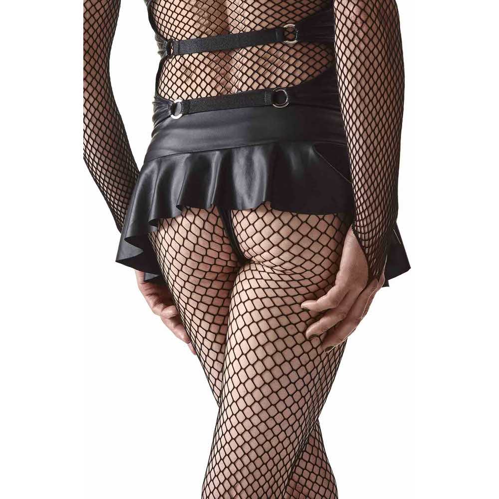 Klasyczna mini spódniczka wykonana z elastycznego, czarnego wetlook’a. Z przodu dłuższa, z tyłu skrócona, aby seksownie odkrywać dół pośladków. Doskonała do nieskrępowanych zabaw i prowokacji.