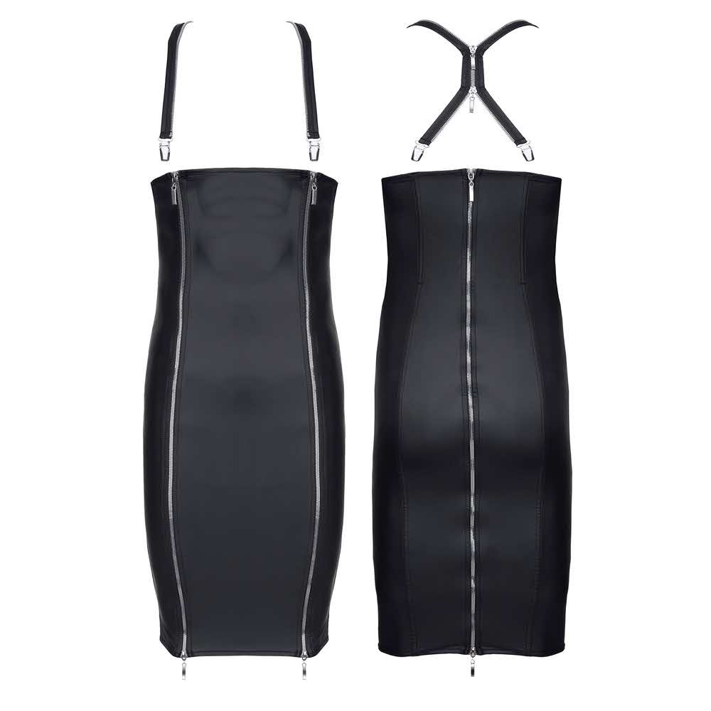 Elegancka i seksowna sukienka z 3-ma suwakami i szelkami. Wykonana z elastycznego wetlook’a 360 stopni. Dzięki czemu idealnie dopasowuje się do ciała podkreślając jego walory. Długość: od kolan do piersi. Z przodu 2 srebrne ekspresy z tyłu 1-en. Odpinane 2-u stronnie, posiadają ozdobne suwaki. Ekspresy są elementami ozdobnymi, ale także służą wygodnemu założeniu oraz zapraszają do zmysłowych prowokacji. Profilowany krój sukienki pięknie podkreśla sylwetkę i uwydatnia pośladki. Szelki. posiadają 4 ozdobne, metalowe zapięcia. Oryginalny wygląd zawdzięczają srebrnemu ekspresowi, który jest ich bazą. Długość szelek można regulować dzięki zapięciu suwaków. Sukienka i szelki stanowią wizualne spójny zestaw zachwycający swoją oryginalnością i unikalnością.