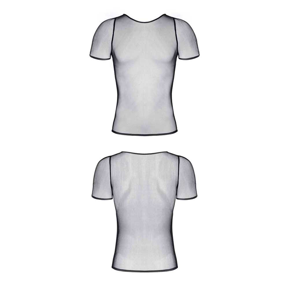 Koszulka wykonana z elastycznej, czarnej siateczki. Przy szyi i rękawkach obszyta elastyczną taśmą z czarnego wetlook’a. Doskonale dopasowuje się do ciała podkreślając jego walory.